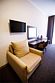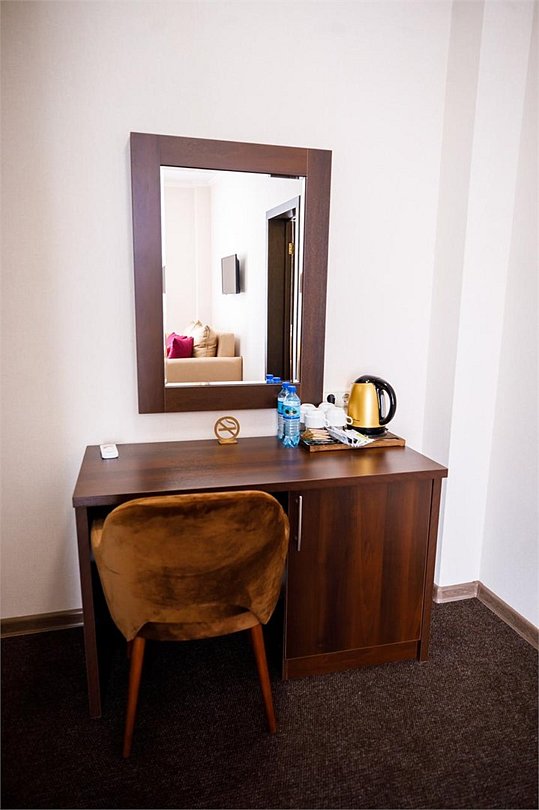 В номере имеется телевизор, кондиционер, шкаф, вешалки, зеркало, туалетный столик, холодильник, рабочий стол, стулья, чайник.