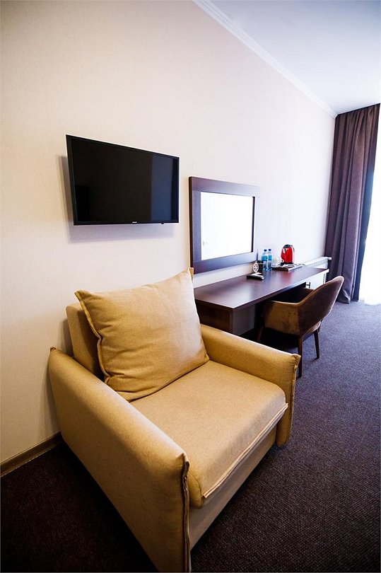 В номере одна двуспальная кровать или две односпальных кровати и кресло-кровать. Имеется телевизор, кондиционер, шкаф, вешалки, зеркало, туалетный столик, холодильник, рабочий стол, стулья, чайник. Индивидуальная ванная комната: душ, раковина, туалет.