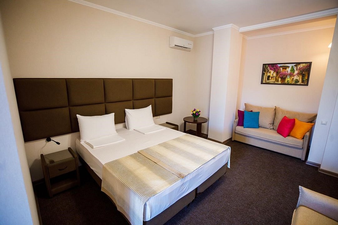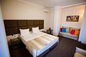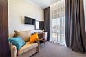 Полулюкс двухместный номер с балконом площадью тридцать пять квадратных метров с видом на горы и море. Подходит для размещения четырех человек (два основных места и два дополнительных).