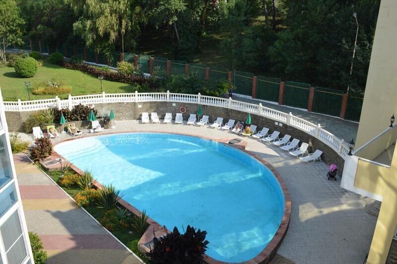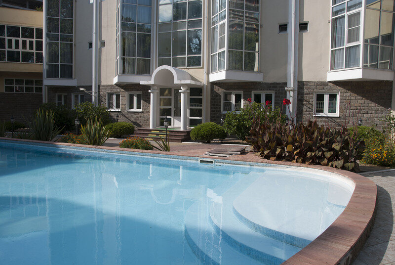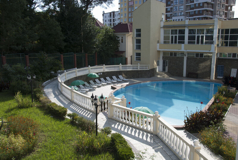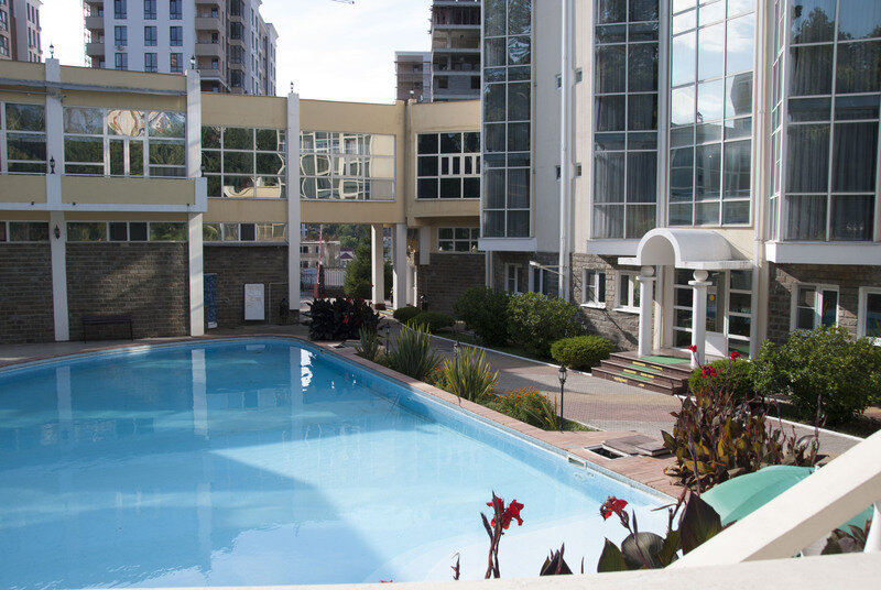 У современного 5-этажного комплекса – своя благоустроенная территория с реликтовыми соснами и субтропической зеленью. В инфраструктуре отеля – сезонный бассейн и сауна, спортплощадка с тренажерами и бесплатная парковка возле корпуса.