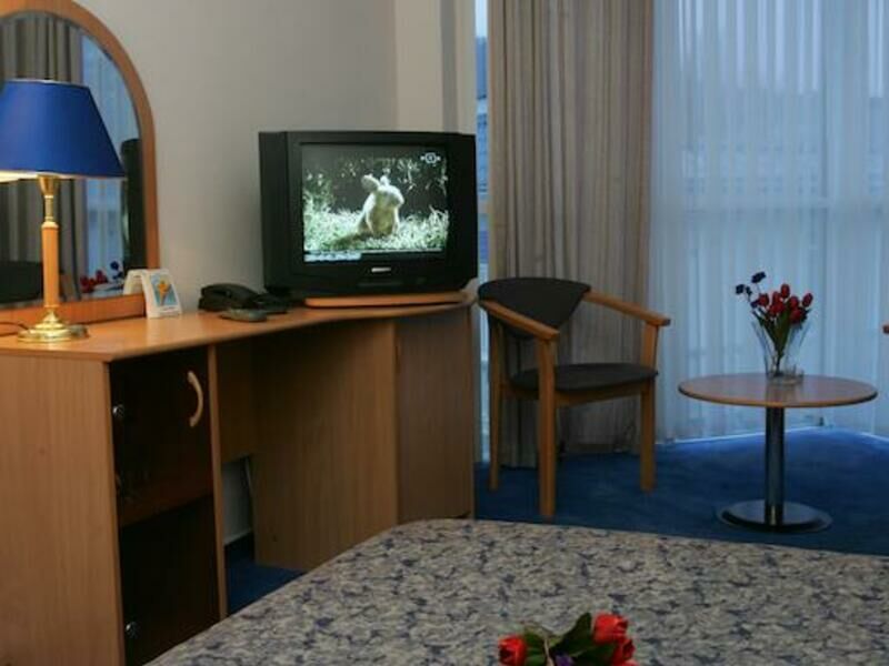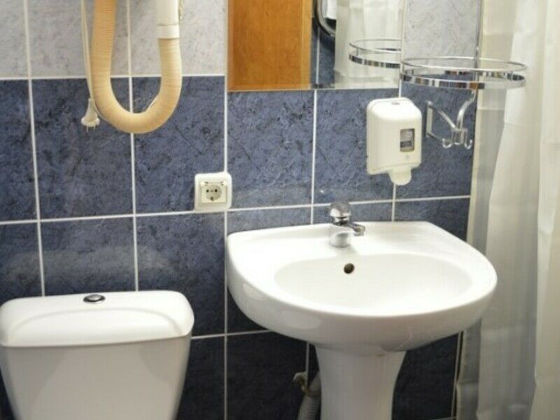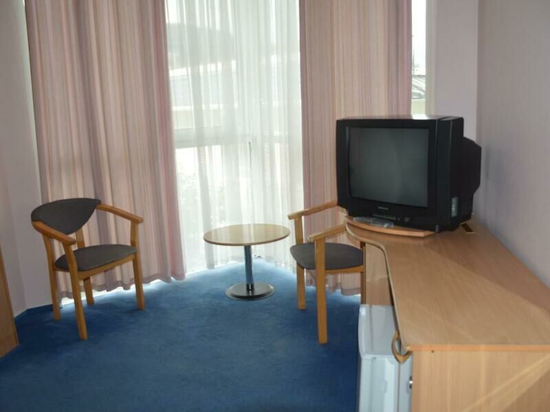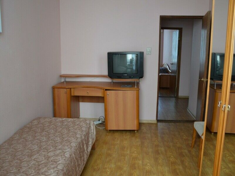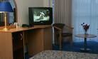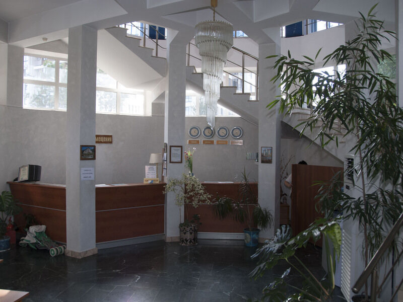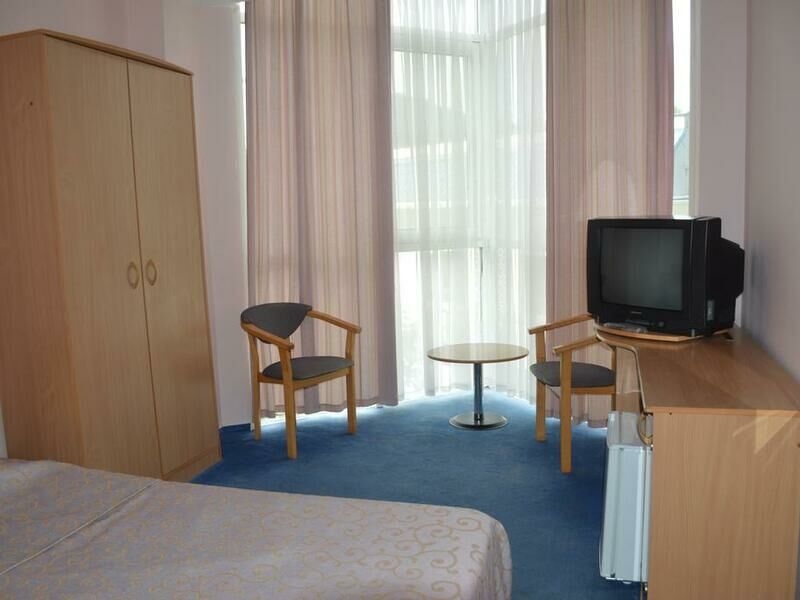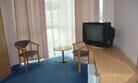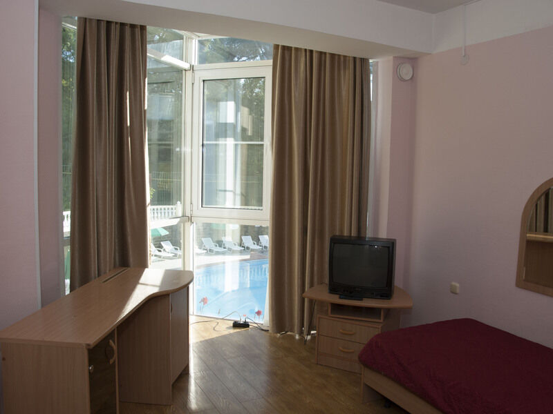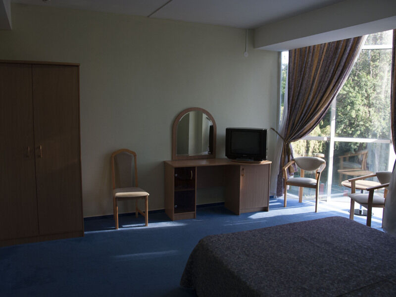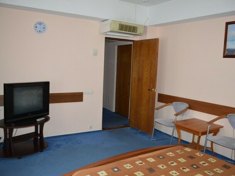 В номерах уютно, мебель немного старовата и потёртая, но нас это не смущало. Есть телевизор, холодильник, кондиционер, фен, чайник, чашки, графин, стаканы (Номер люкс). -
