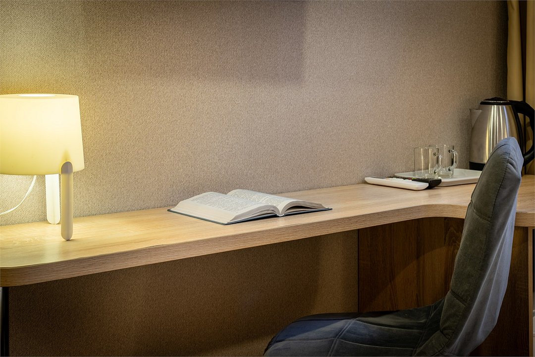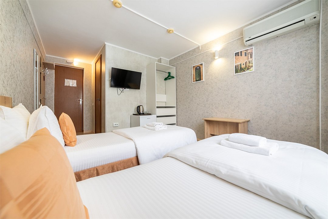 телевизор, Wi-Fi, кондиционер, светильник, банные полотенца, две односпальные кровати, шкаф для одежды, вешалки, зеркало, унитаз, раковина, душ, вид на город, кулер на этаже, стул, стол, тумба, мини-холодильник, номер для некурящих, кресло-кроватьВ гостиничном номере