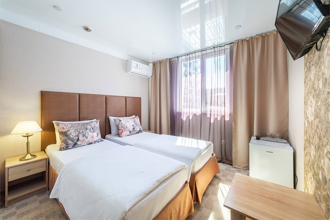 телевизор, Wi-Fi, кондиционер, светильник, банные полотенца, две односпальные кровати, шкаф для одежды, вешалки, зеркало, унитаз, раковина, душ, вид на город, кулер на этаже, стул, стол, тумба, мини-холодильник, номер для некурящихВ гостиничном номере