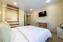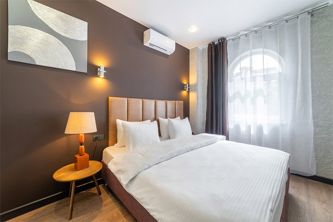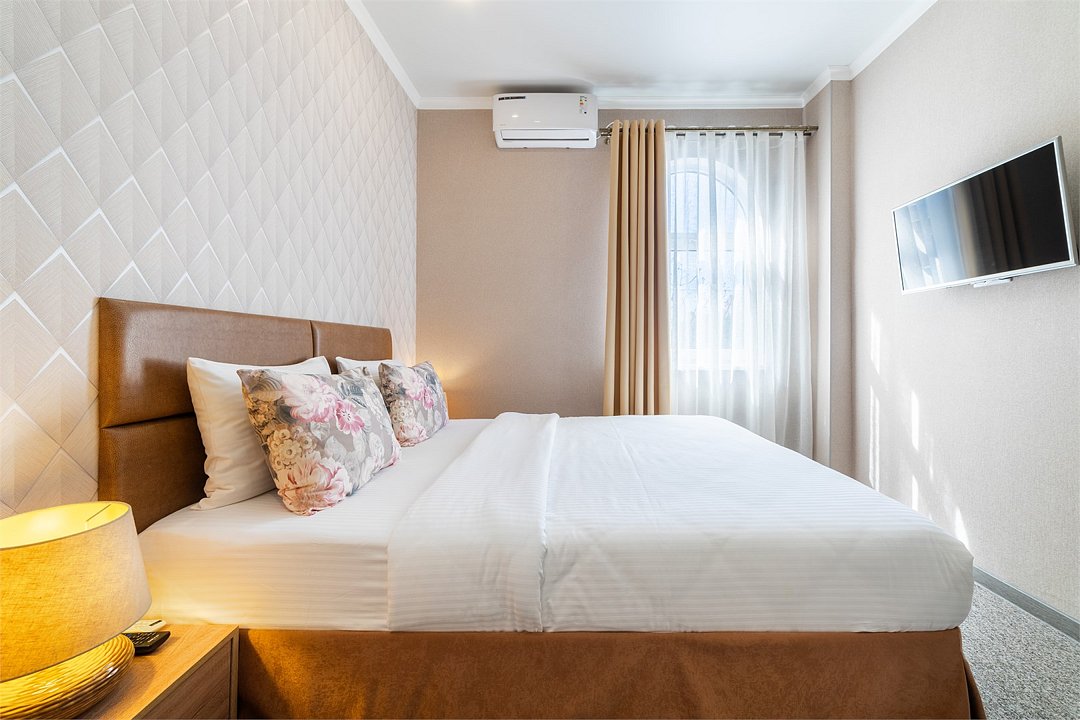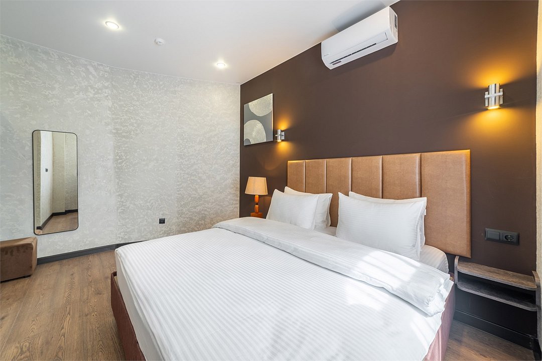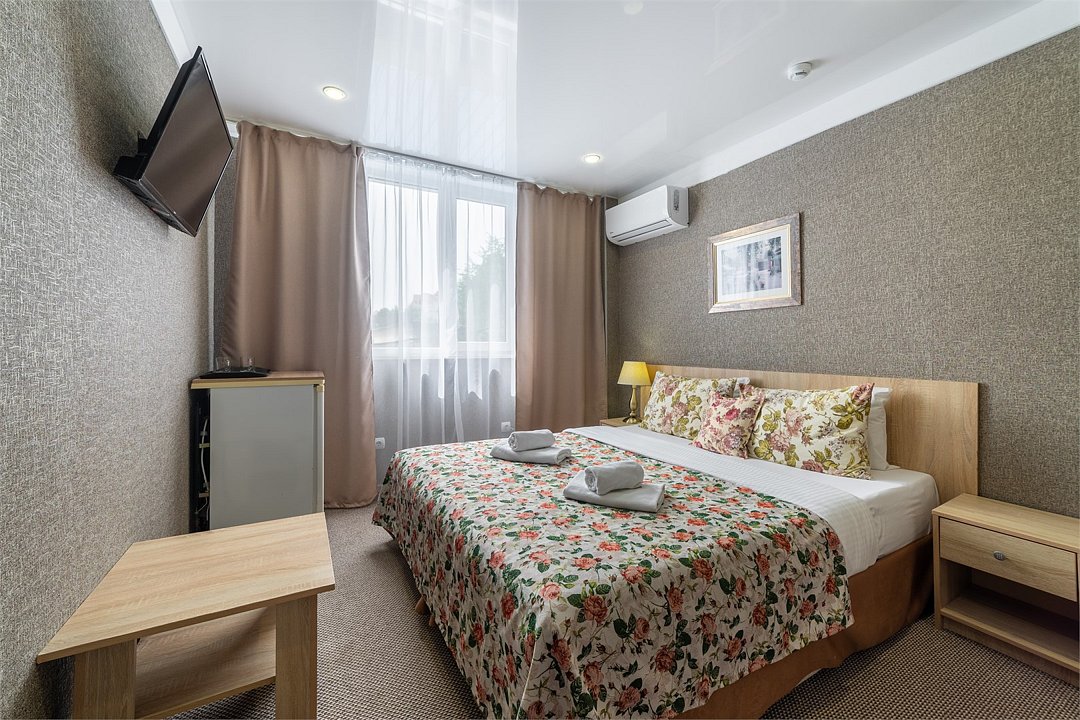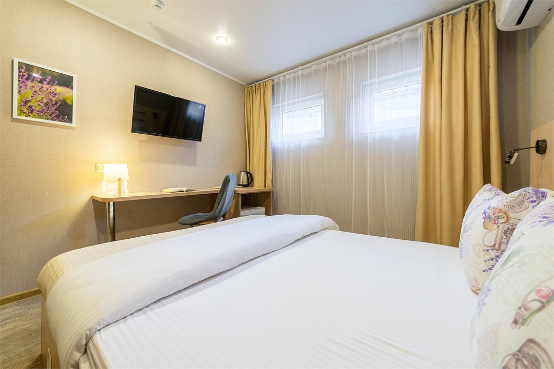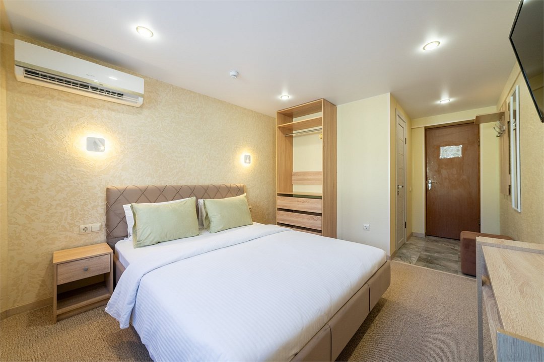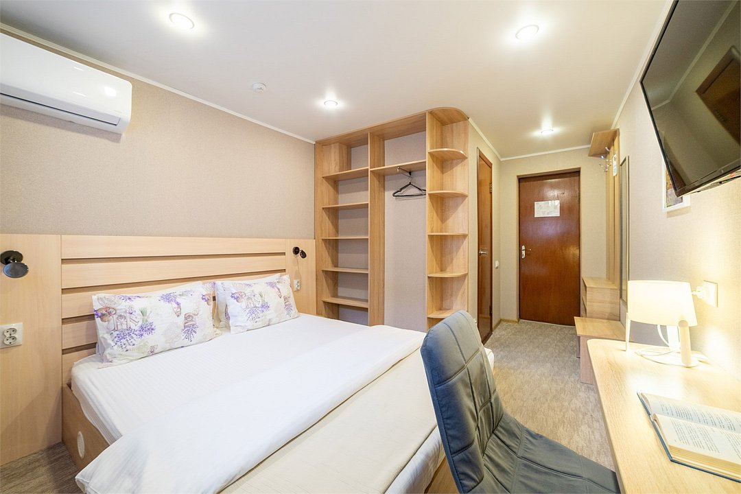 телевизор, Wi-Fi, кондиционер, светильник, банные полотенца, двуспальная кровать, шкаф для одежды, вешалки, зеркало, унитаз, раковина, душ, вид на город, кулер на этаже, стул, стол, тумба, мини-холодильник, номер для некурящихВ гостиничном номере