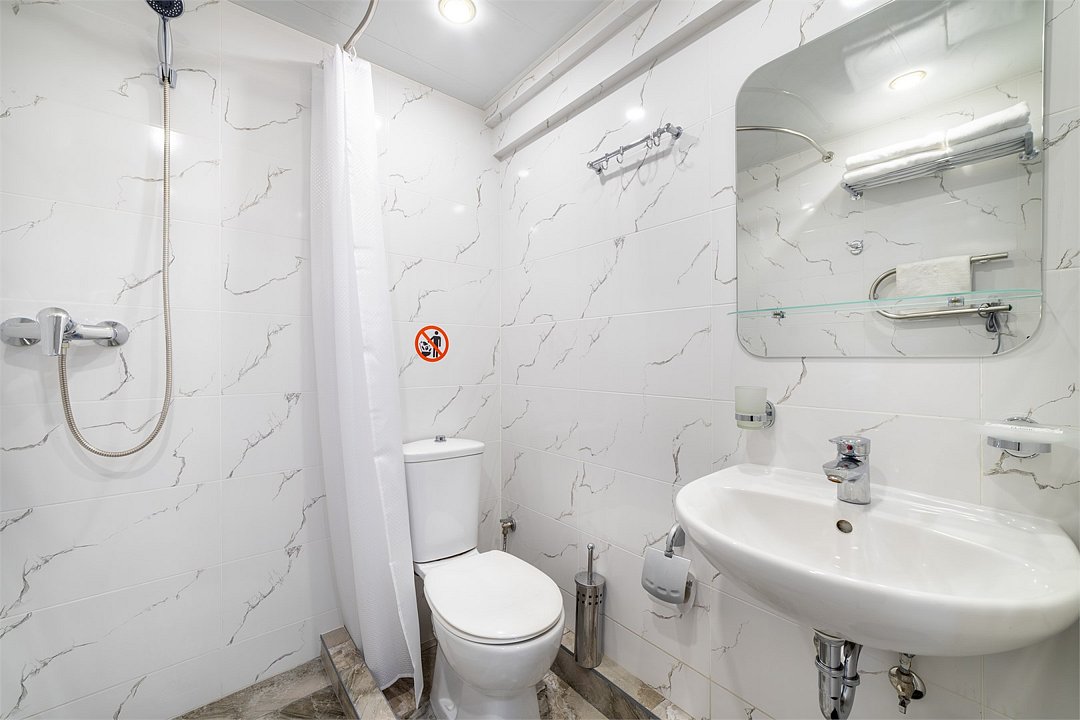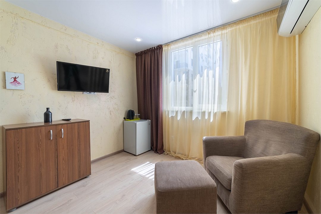 телевизор, Wi-Fi, кондиционер, настольные лампы, фен, банные полотенца, диван, шкаф для одежды, вешалки, зеркало, чайник, унитаз, раковина, душ, кулер на этаже, кресло, стул, стол, тумба, мини-холодильник, номер для некурящихВ гостиничном номере