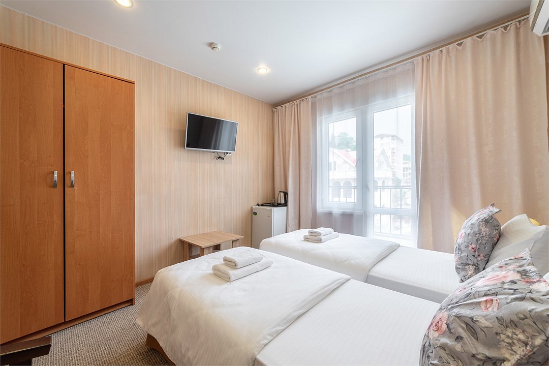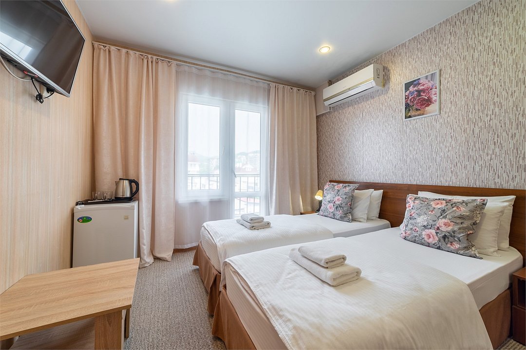 15-17 кв.м., вид на город или бассейн, расположение номеров: 2, 3, 4, 5 этажах. Все номера оборудованы балконами. Односпальные кровати, чайник. В летний период предоставляются пляжные полотенца. Бассейн (без подогрева) работает в период с 1 мая по 30 сентября. Размещение детей с 4-х лет.Услуги и удобства