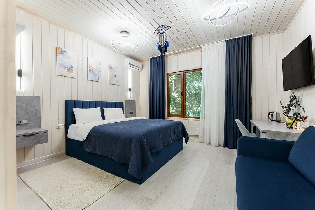 В номерах предусмотрена система «Умный дом» и имеется собственная терраса. Гостям предоставляются ортопедические матрасы, халаты и полотенца. Также в номерах есть всё необходимое: чайник, холодильник, кондиционер, сейф, фен, Wi-Fi, телевизор и настольная лампа.