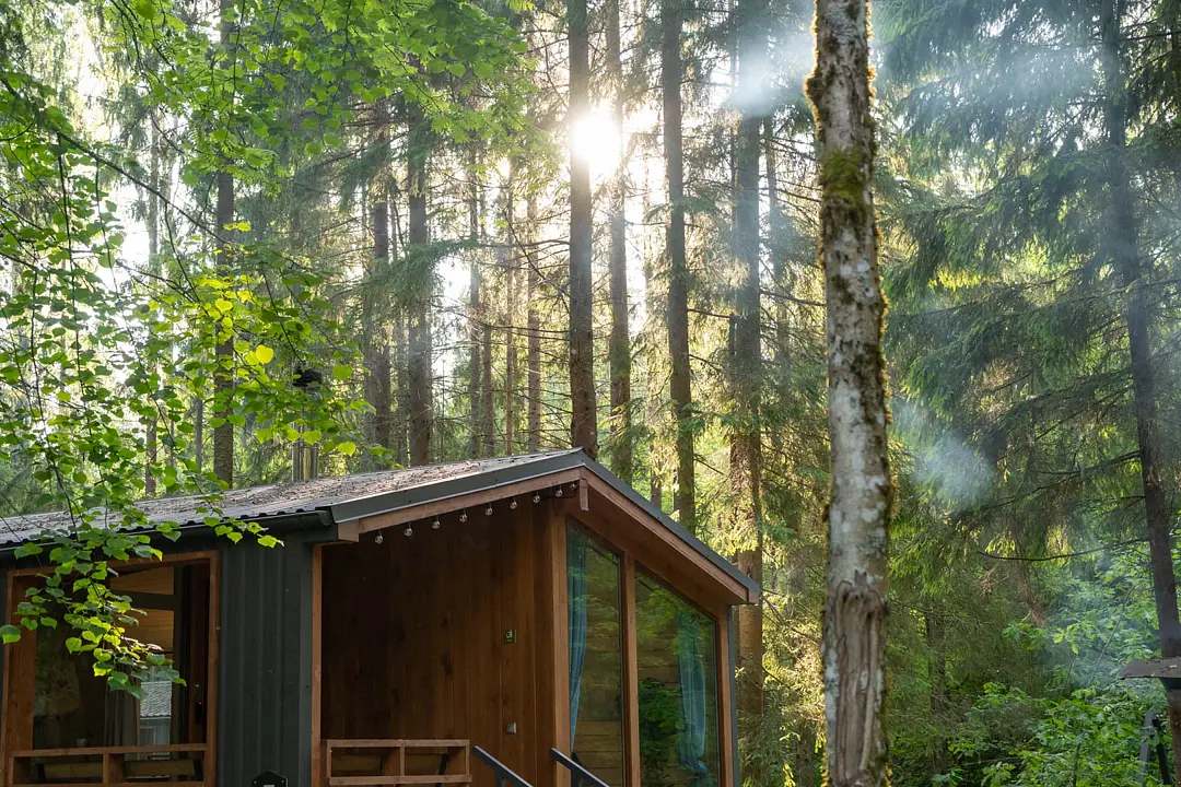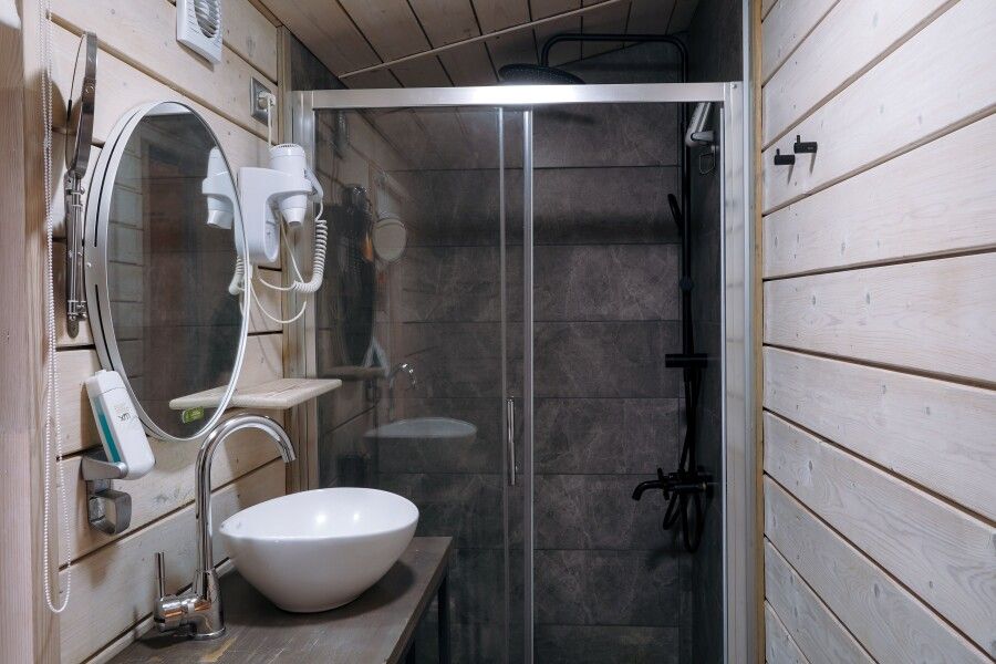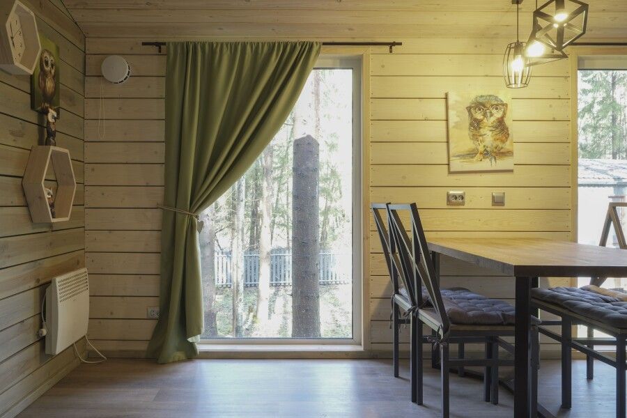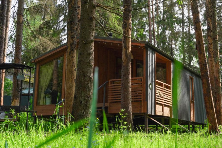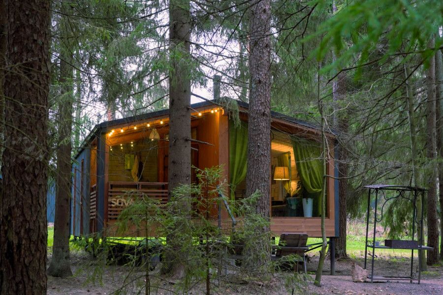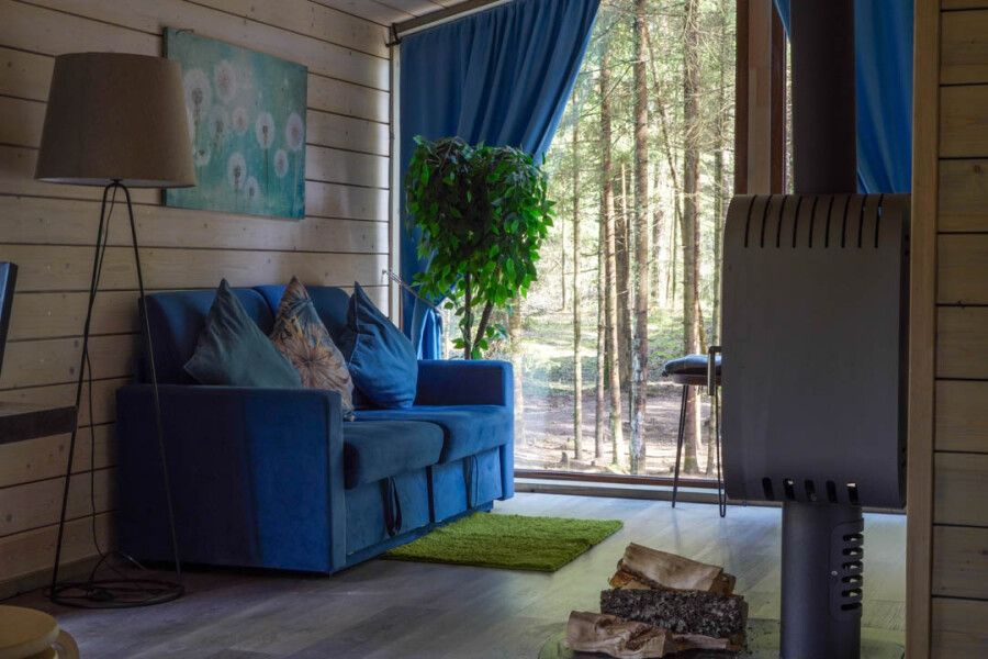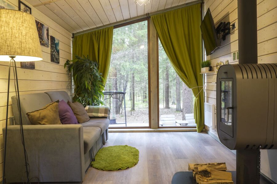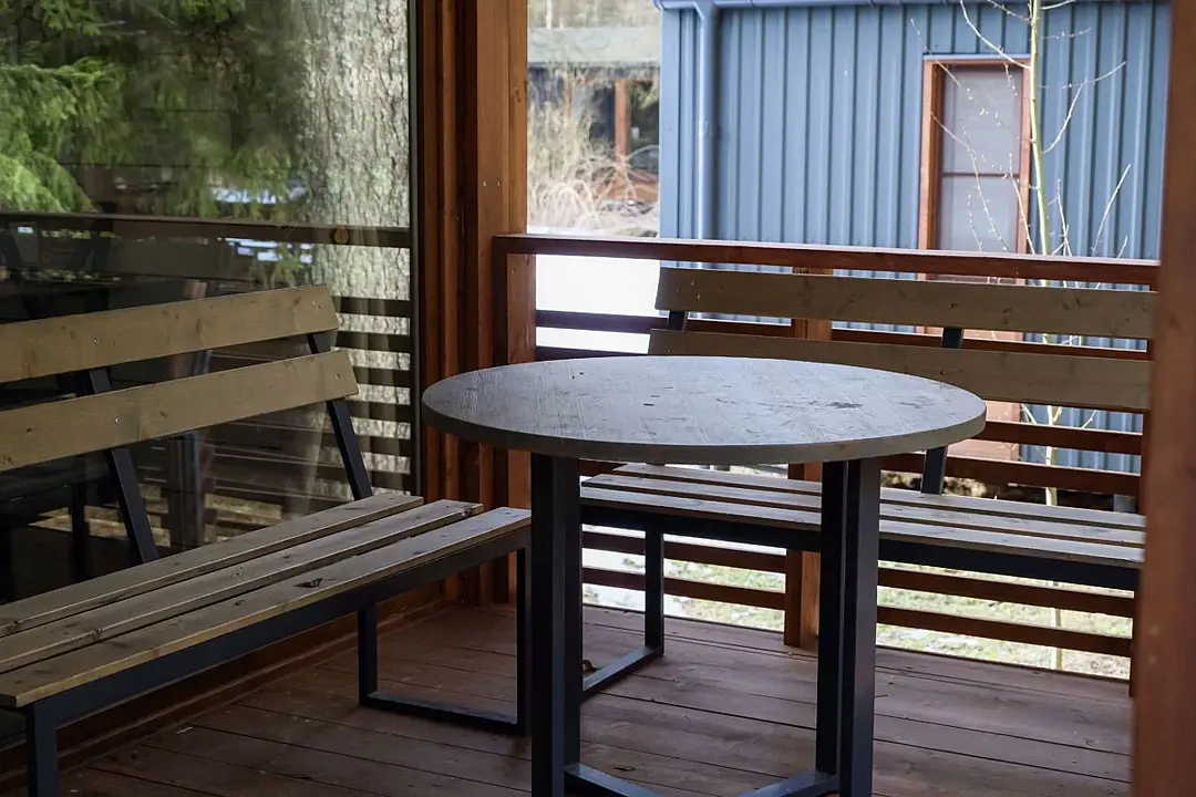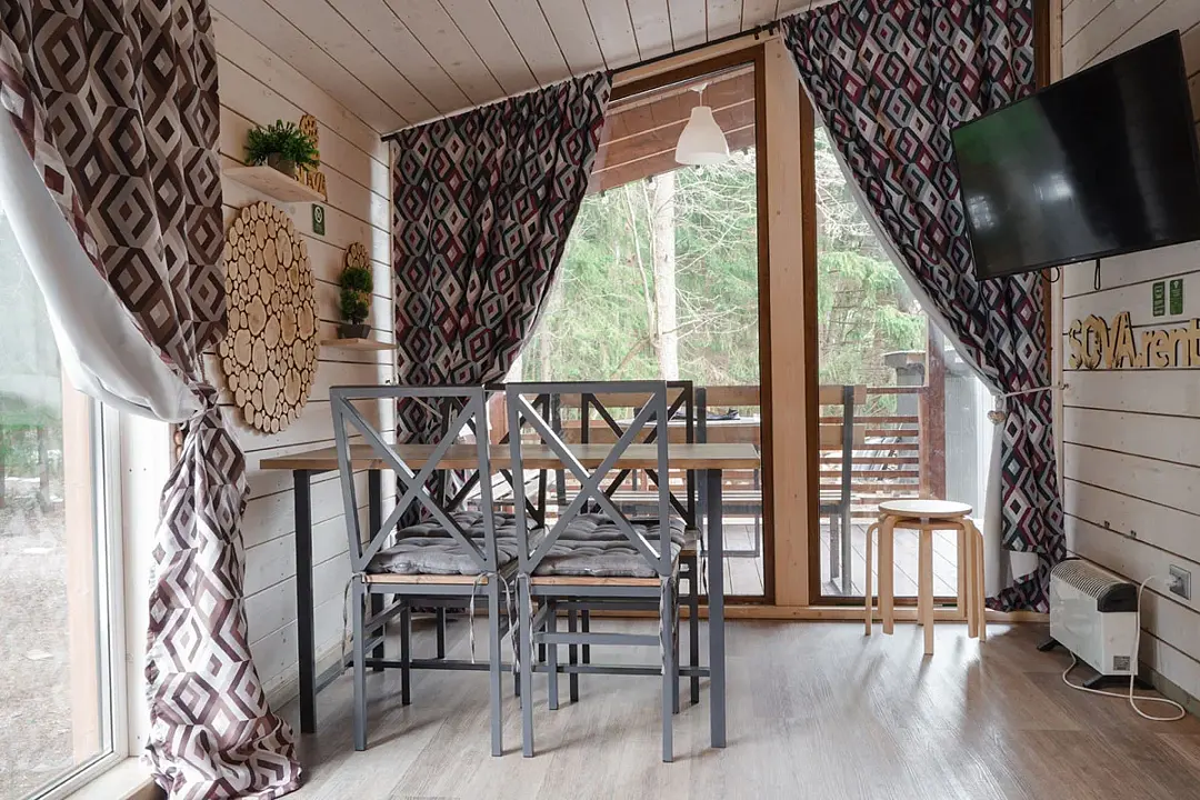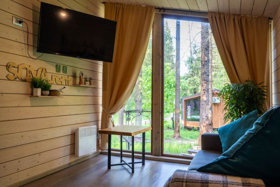 Также вашем распоряжении будут теплый санузел с горячей водой, комната отдыха, освещенная терраса с видом на лес и мангал.