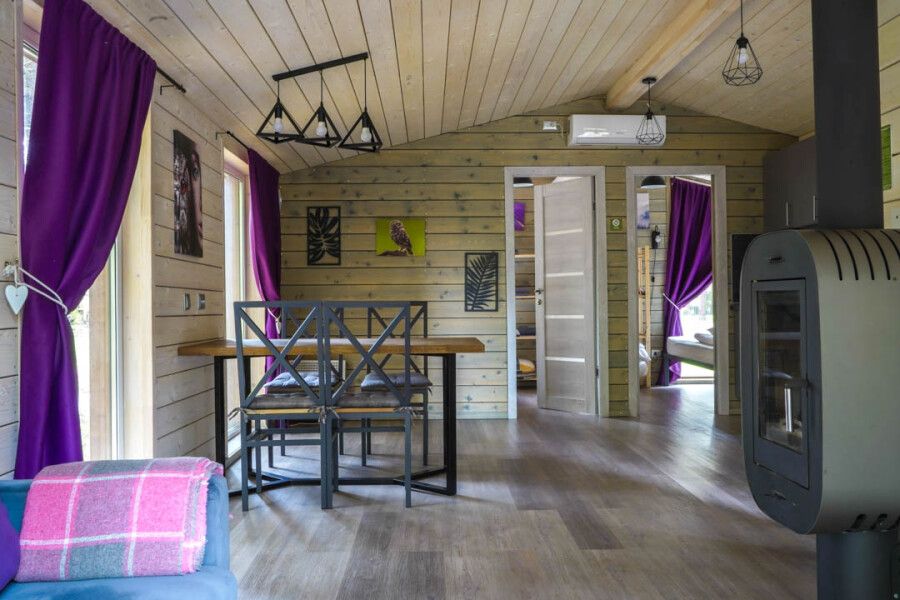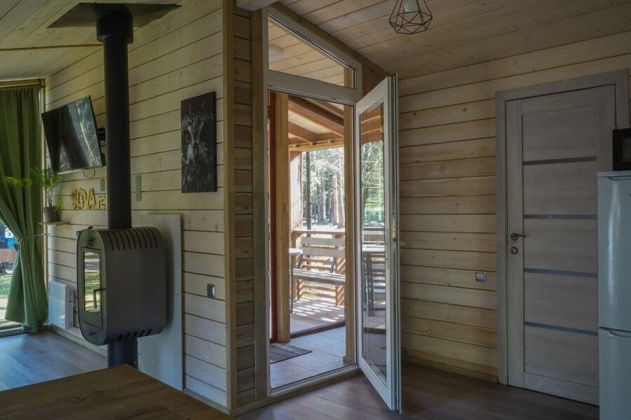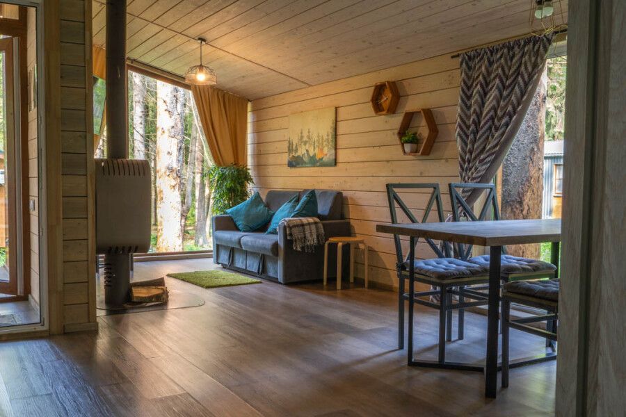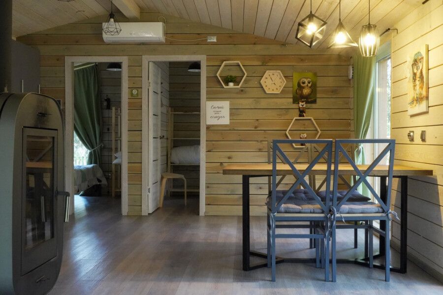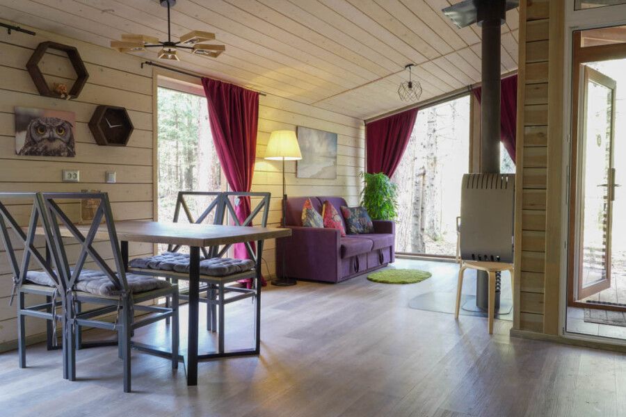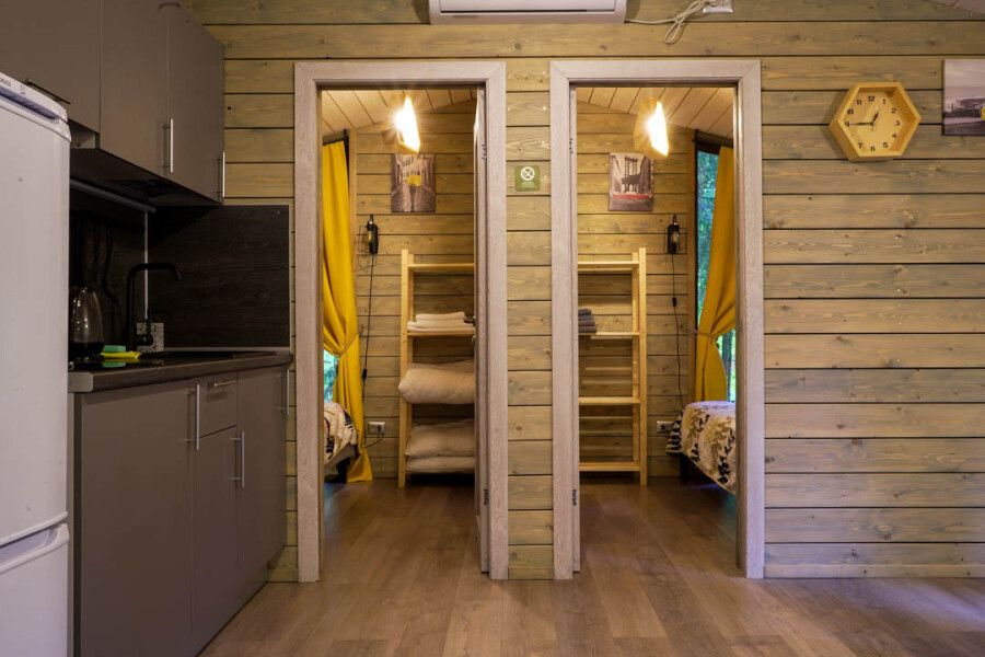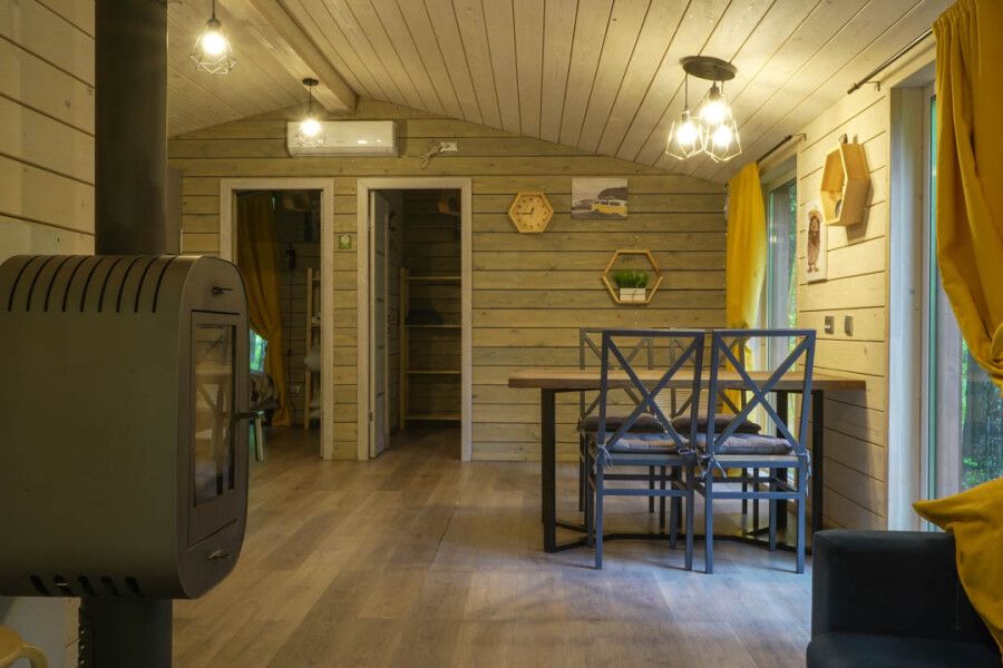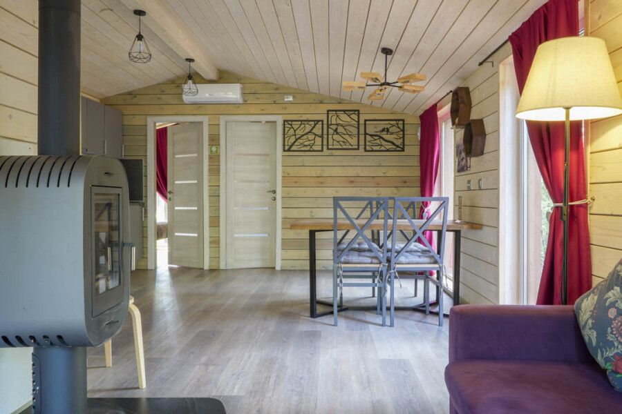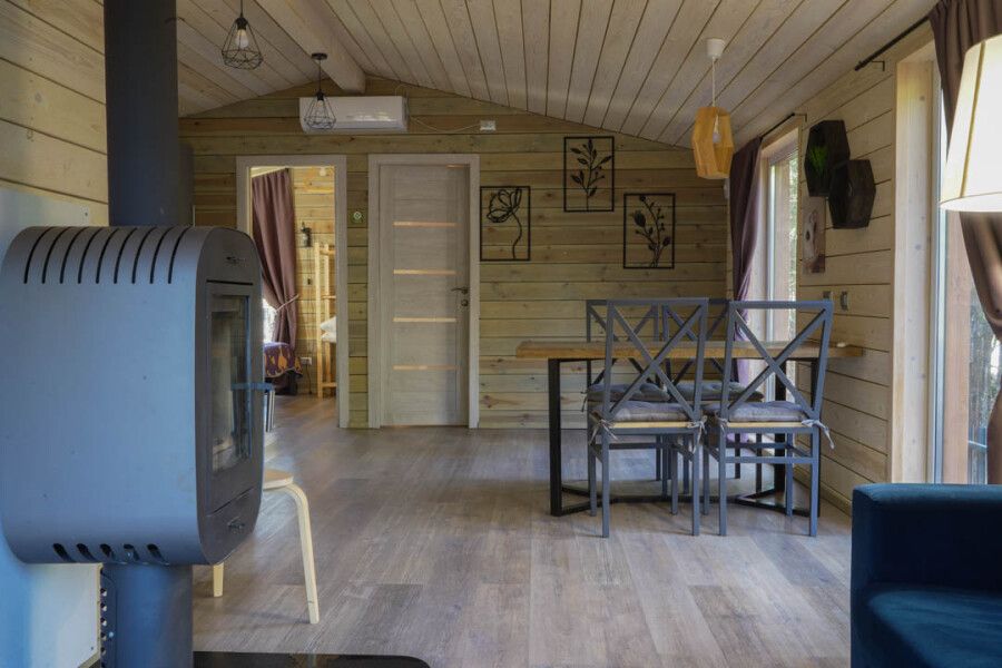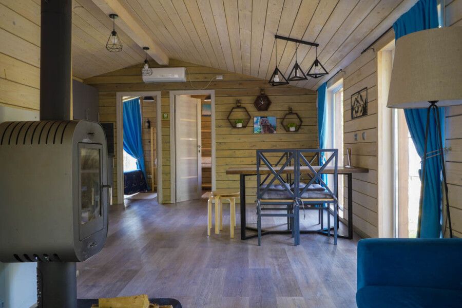Каждый дом имеет общую площадь 60 м² и включает просторную кухню-гостиную с дровяной печью и раскладным двухместным диваном. Кухонная зона полностью оснащена для приготовления пищи: варочная панель, микроволновая печь, двухкамерный холодильник и посуда на шесть человек. Установлен индивидуальный мангал.