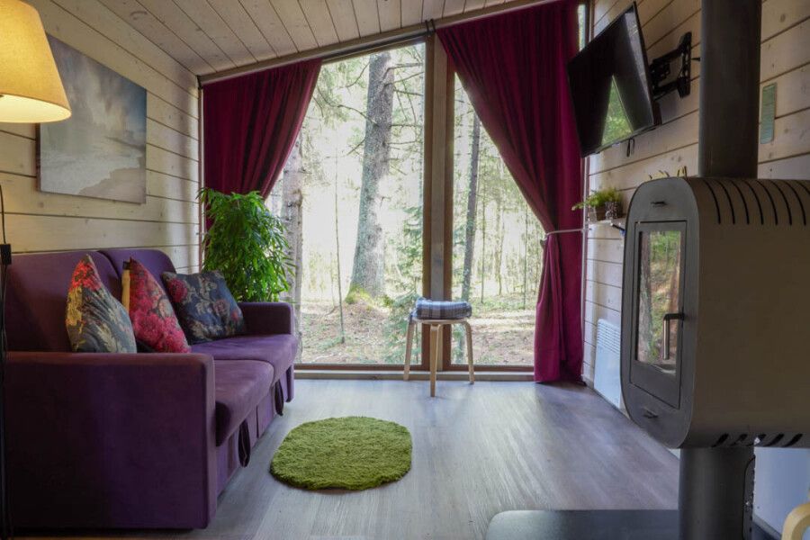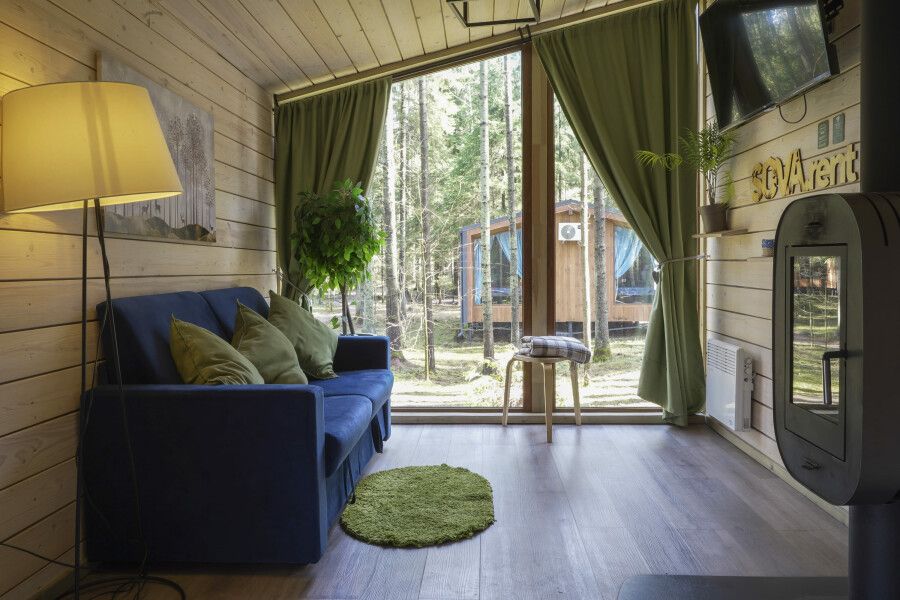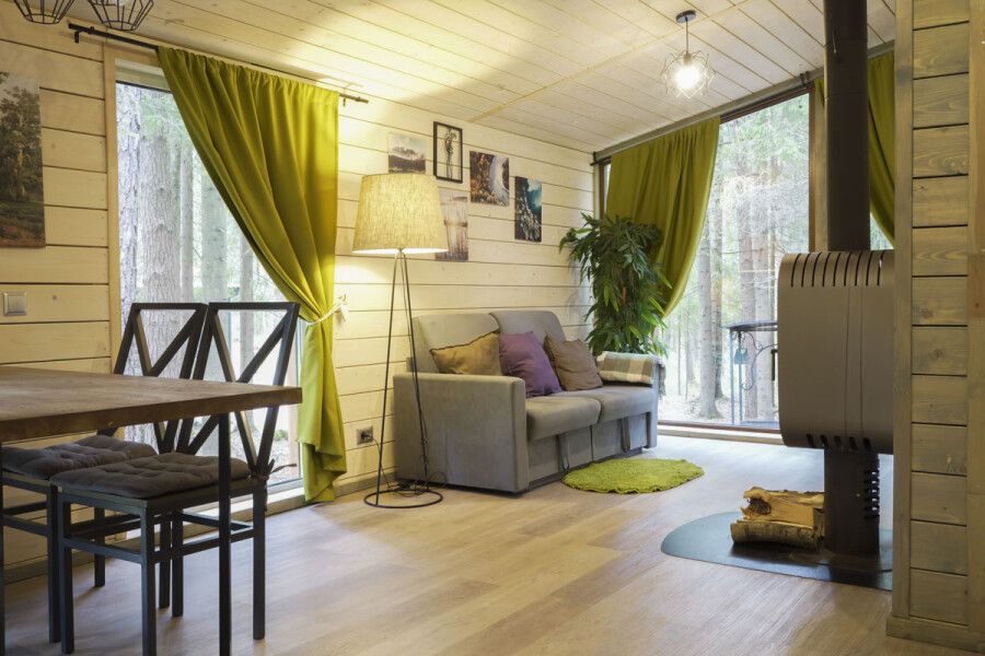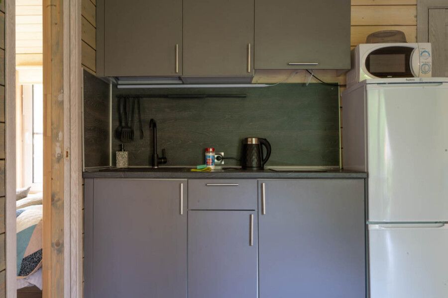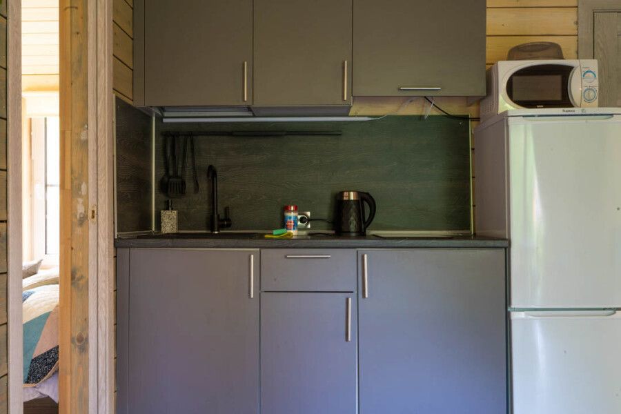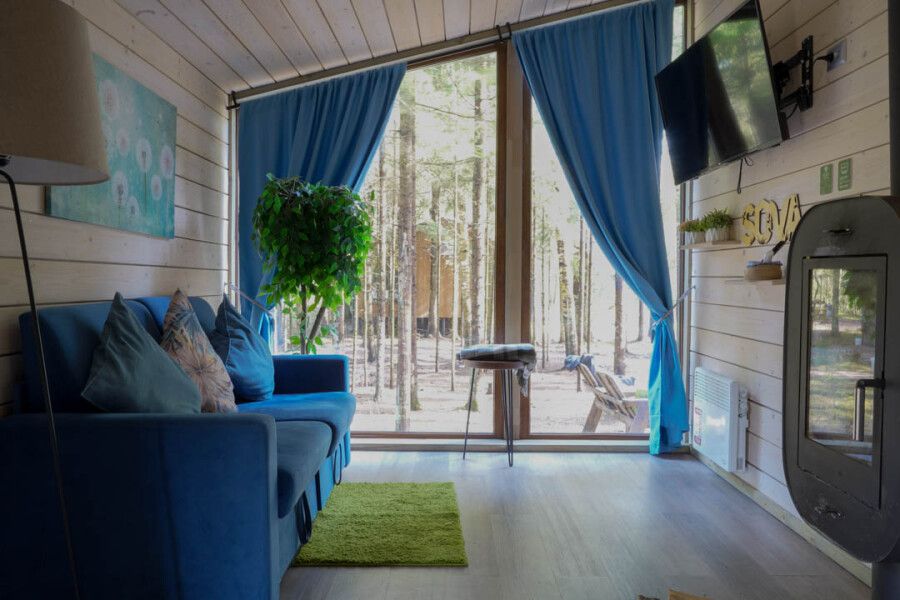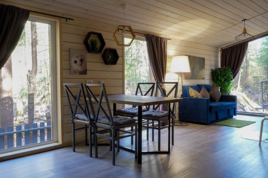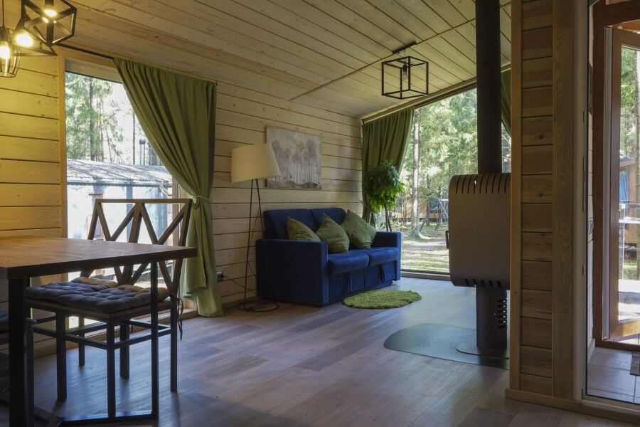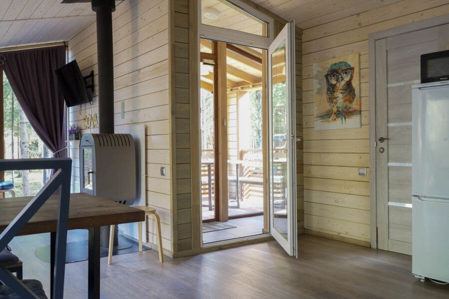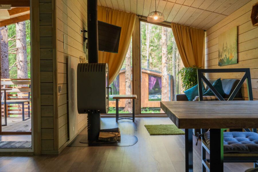 Каждый дом имеет общую площадь 60 м² и включает просторную кухню-гостиную с дровяной печью и раскладным двухместным диваном. Кухонная зона полностью оснащена для приготовления пищи: варочная панель, микроволновая печь, двухкамерный холодильник и посуда на шесть человек. Установлен индивидуальный мангал.