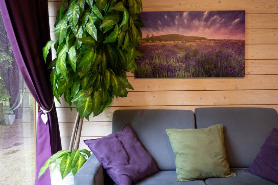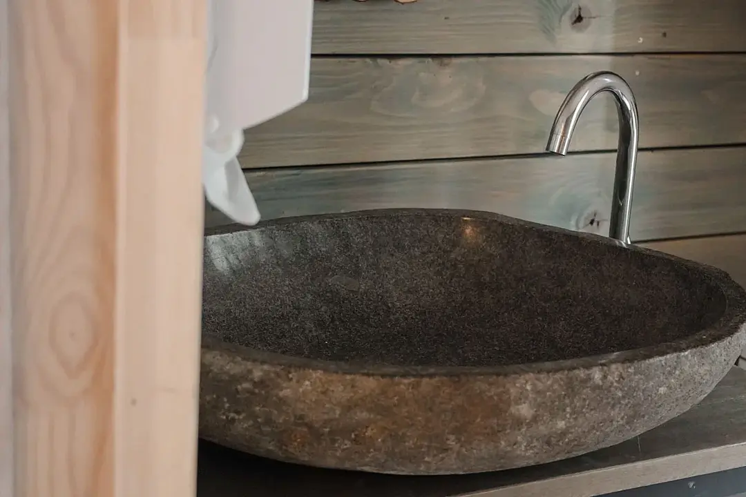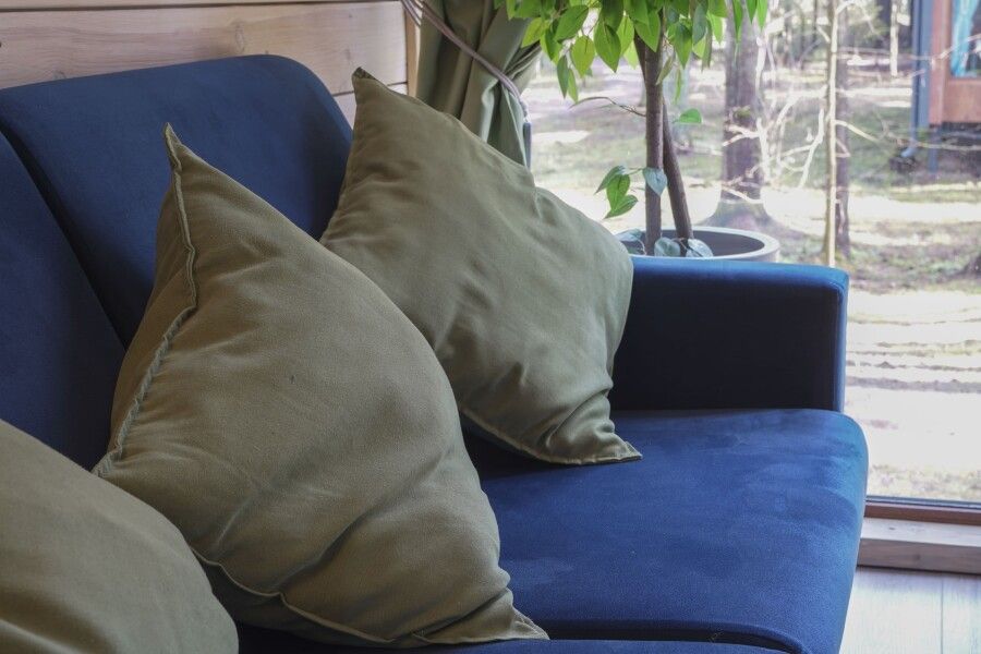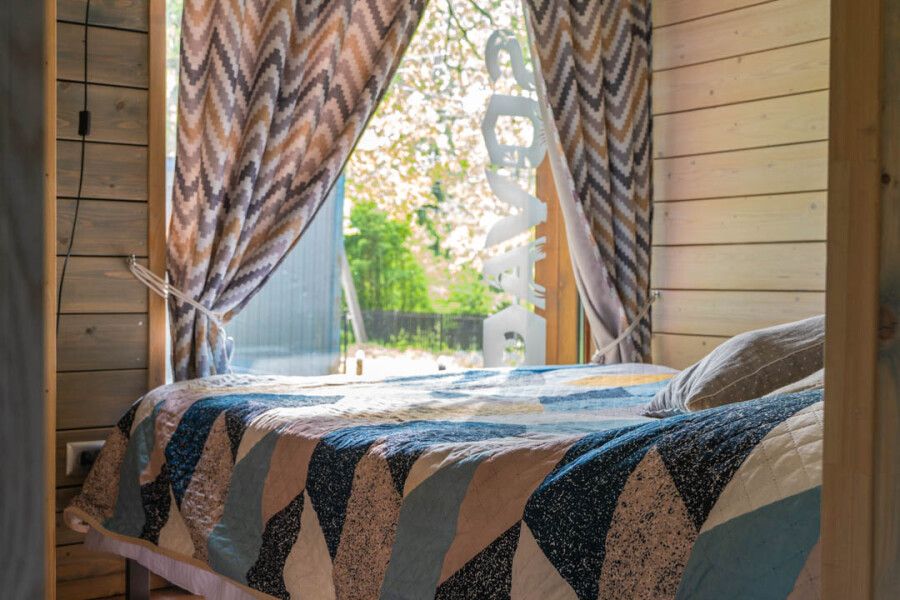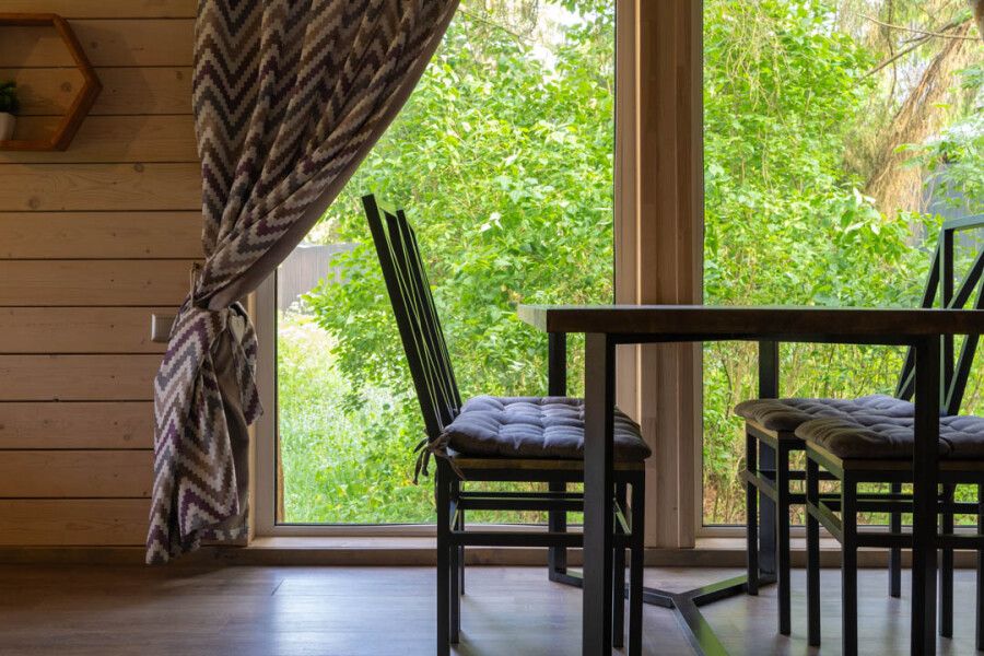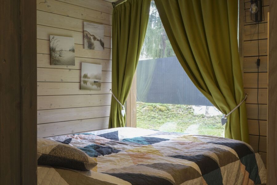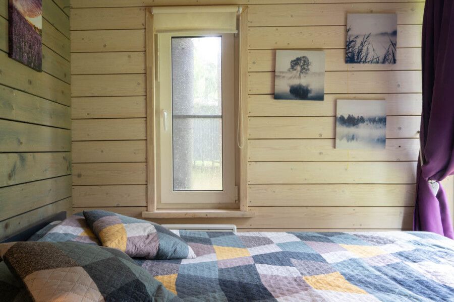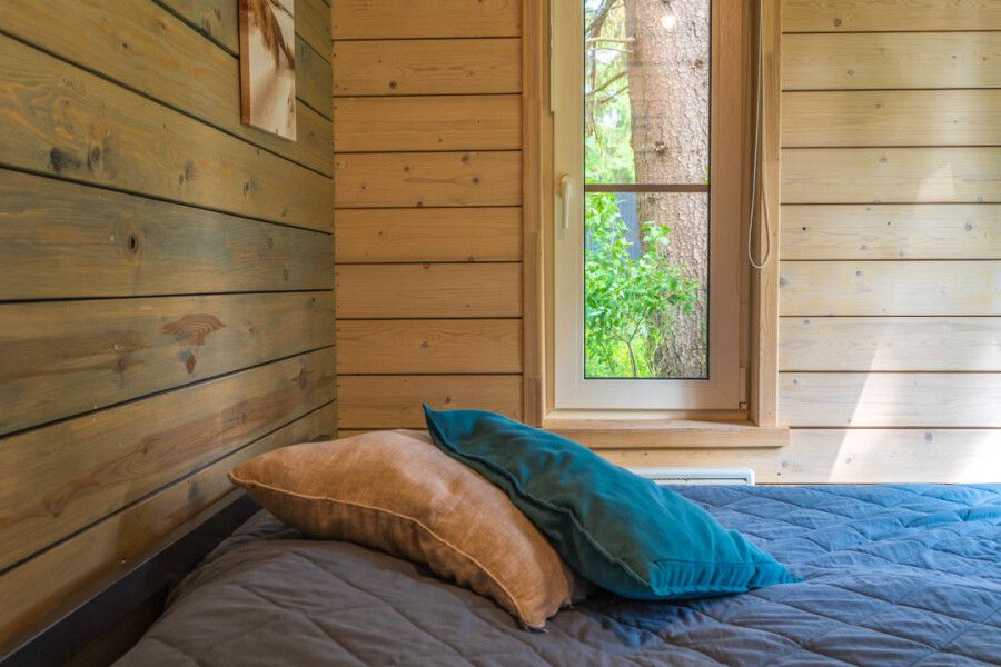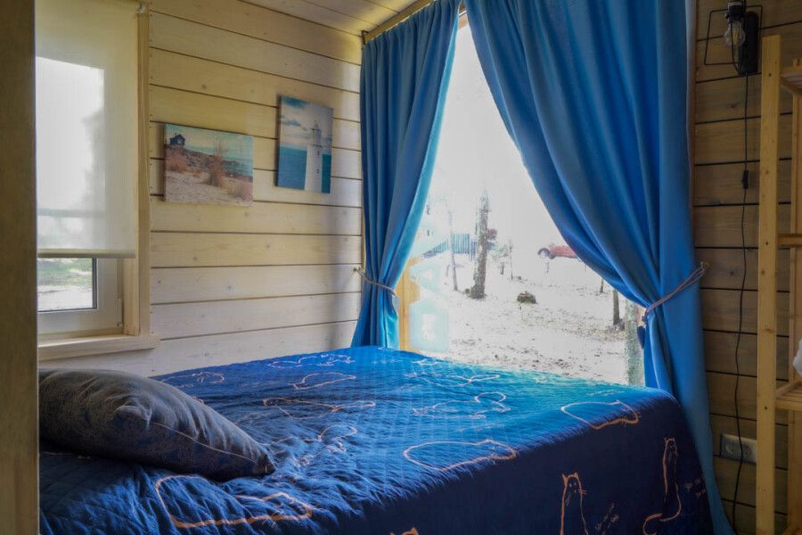 Каждый дом имеет общую площадь 60 м² и включает просторную кухню-гостиную с дровяной печью и раскладным двухместным диваном. Кухонная зона полностью оснащена для приготовления пищи: варочная панель, микроволновая печь, двухкамерный холодильник и посуда на шесть человек. Установлен индивидуальный мангал.