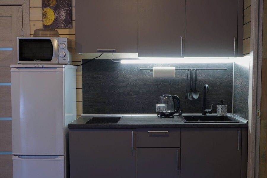 Кухонная зона с полным оснащением для готовки, включая варочную панель, микроволновую печь, двухкамерный холодильник и посуду на 6 персон. Теплый санузел с душем.