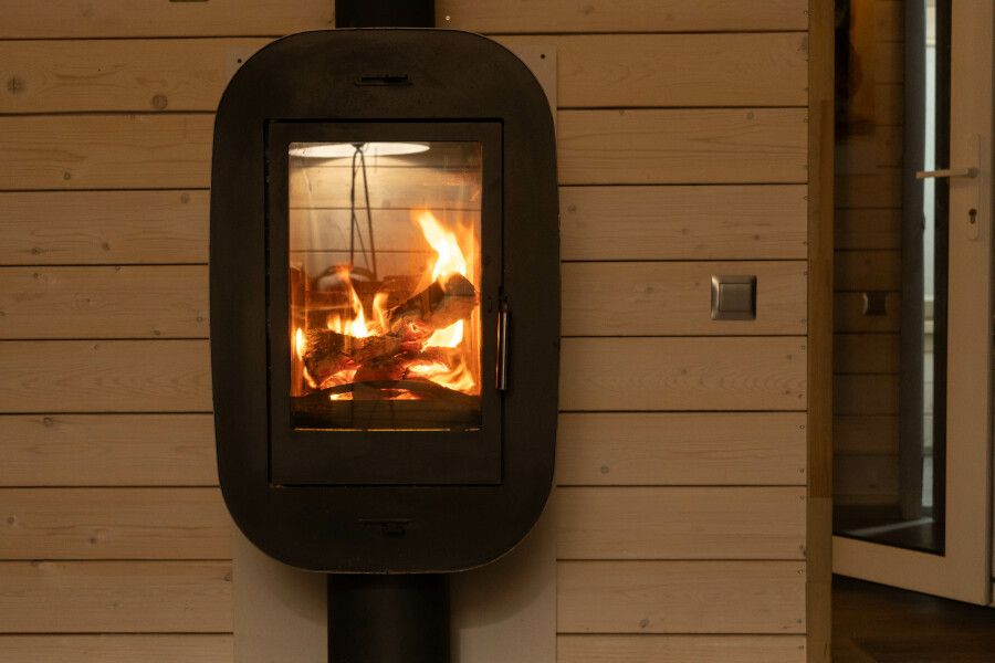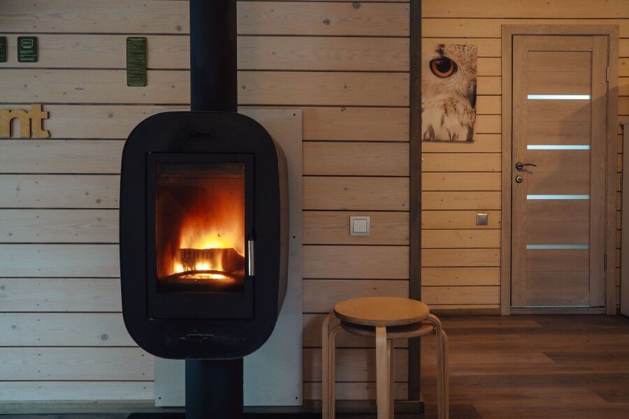 Просторная кухня-гостиная с дровяной печью и двухместным диваном.