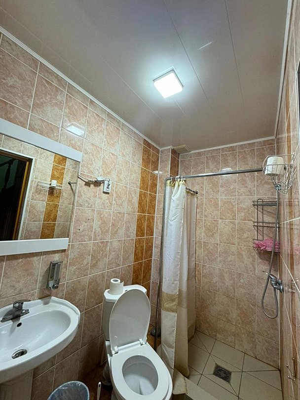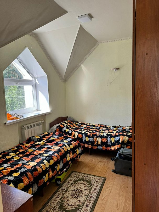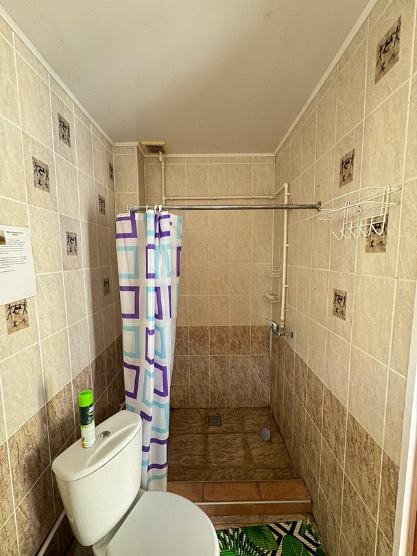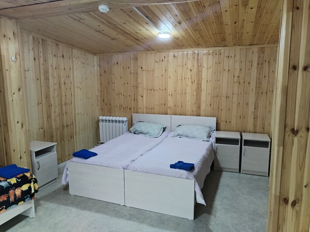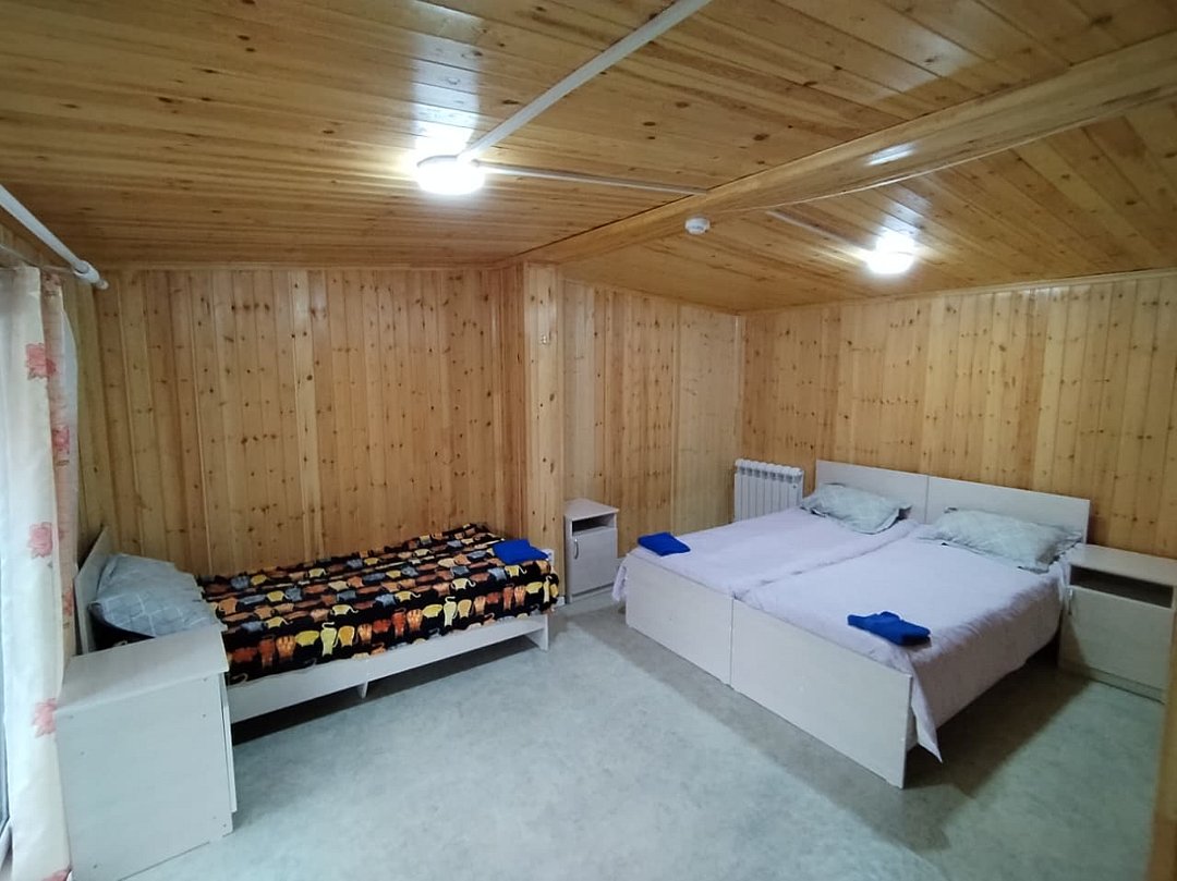 Номер в комфортабельном домике, оснащенном всем необходимым для удобного отдыха: оборудован односпальной и двуспальной кроватью, шкафом, тумбочками, а также имеет душ и туалет на два номера. Чайник, чай и кофе предоставляются.