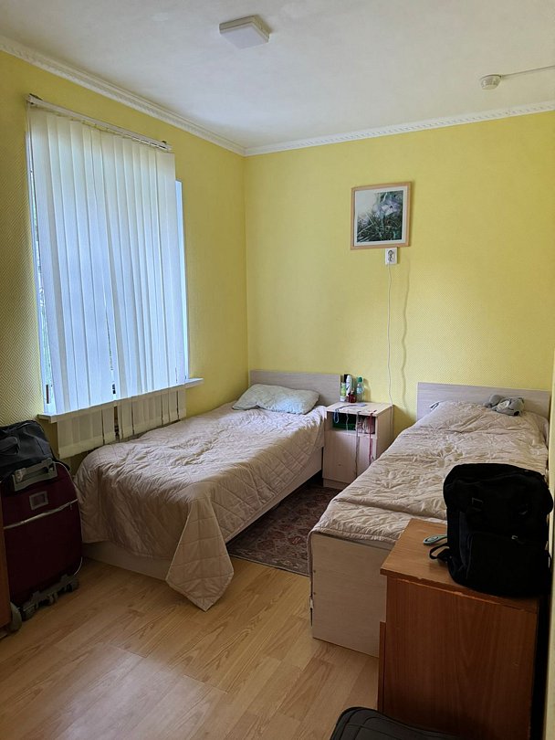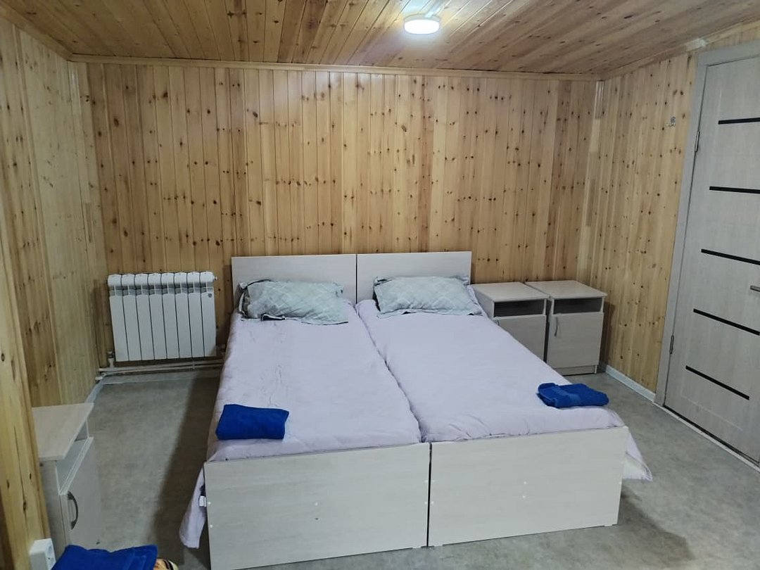 Номер в комфортабельном домике, оснащенном всем необходимым для удобного отдыха: оборудован двумя односпальными кроватями, шкафом, тумбочками, а также имеет душ и туалет на два номера. Чайник, чай и кофе предоставляются.