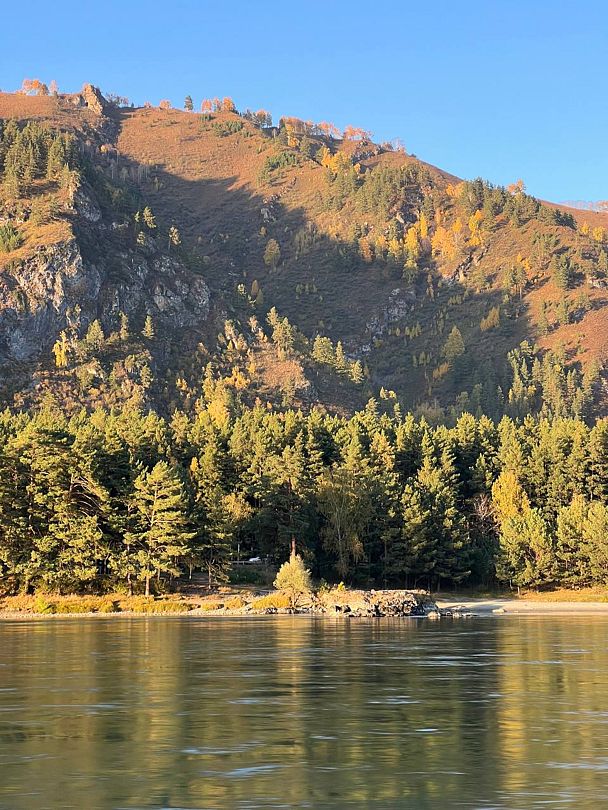 Путь: База «Гранд Алтай» — с прохождением манжерокских порогов, проплывая тихий залив, мост Ая с видом на гору «Чертов палец» до туристического объекта «Кедровый остров». По приезду происходит высадка на берег.