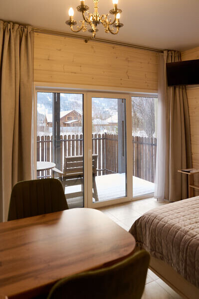 Завораживающие горные пейзажи доступны вашему взору в любую пору благодаря большим панорамным окнам и уютным террасам. Интерьер каждого шале — это отдельная история, где индивидуальный дизайн и цветовая гамма создают особую атмосферу по вашему вкусу.