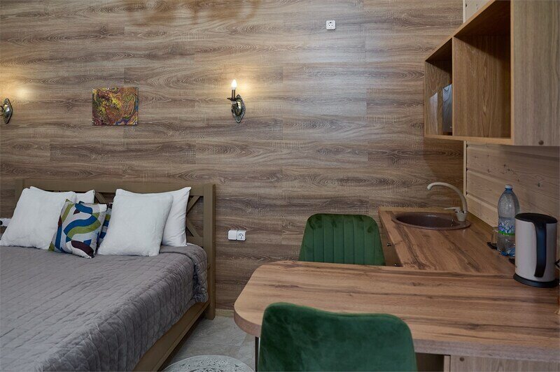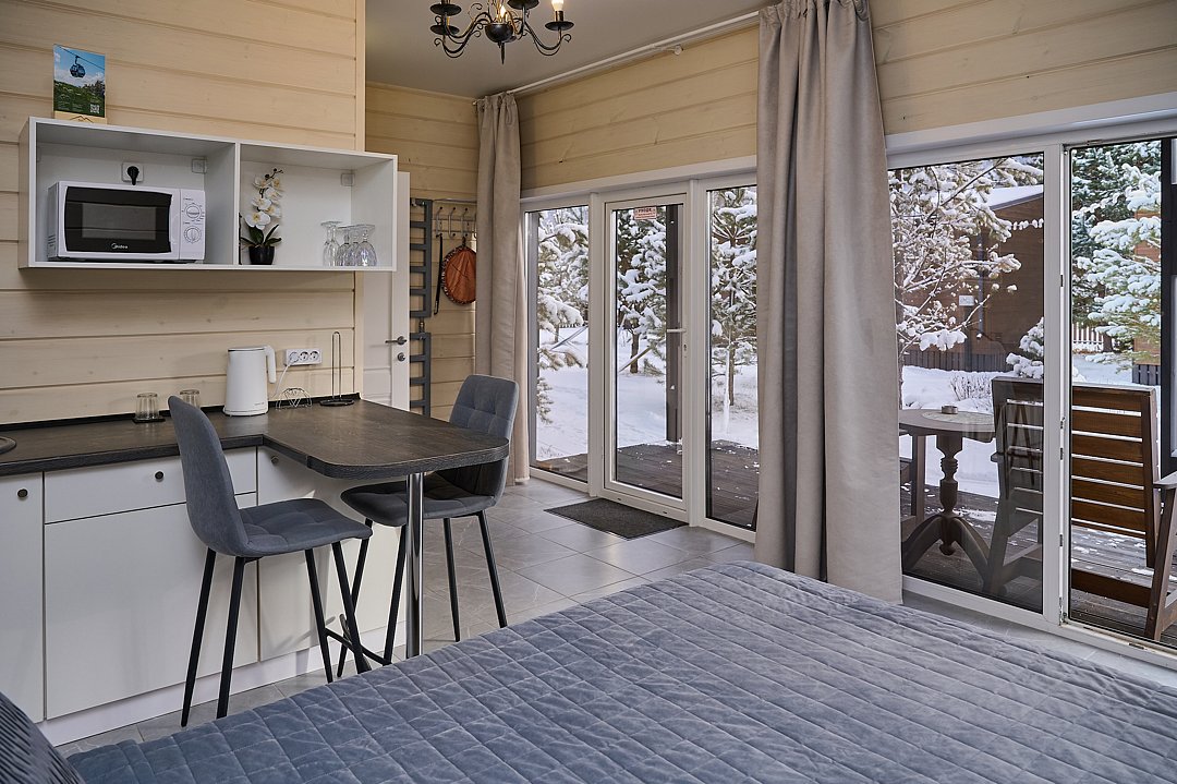 Круглогодичный отдельный дом студия 22 м, с панорамными окнами и террасой, вид на горы, вместит двоих (троих гостей, предоставляется евро-раскладушка) гостей.