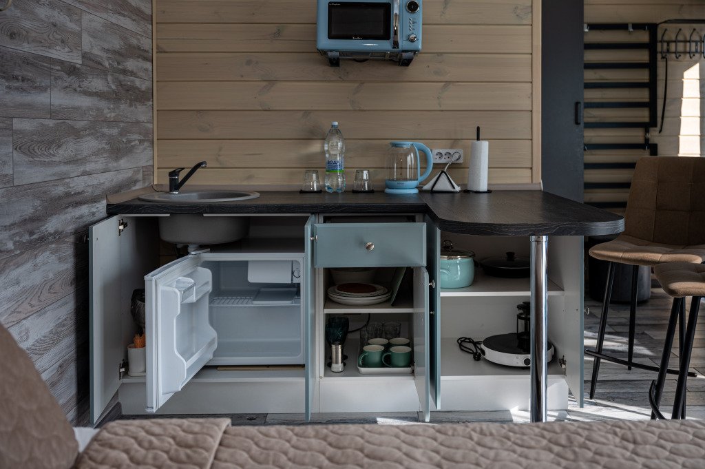 Оснащен мини-кухней, холодильник, чайник, микроволновая печь, индукционная плитка, есть вся необходимая посуда, своя мангальная зона для приготовления любимых блюд.