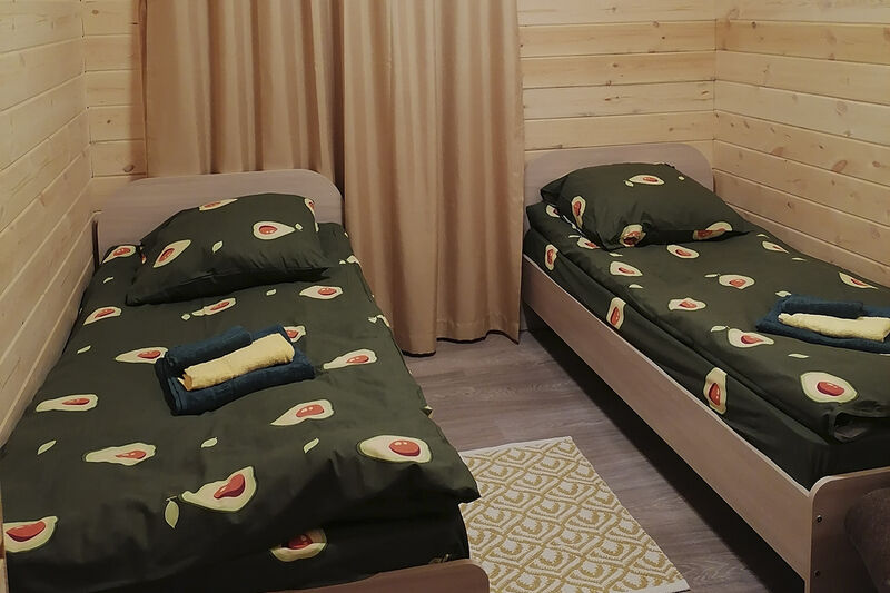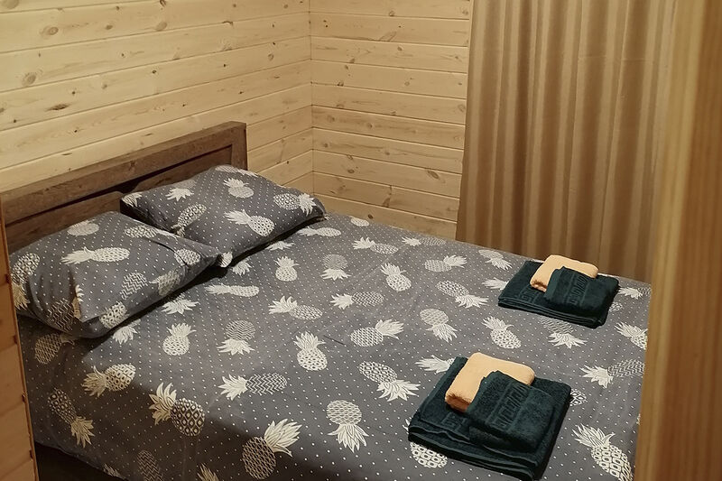 На улице личная беседка для отдыха. В домике прихожая для багажа и обуви, зеркало, вешалка. Комната с окном, кровать двуспальная (возможна комплектация 2-мя односпальными), тумба с зеркалом, посуда.