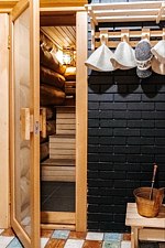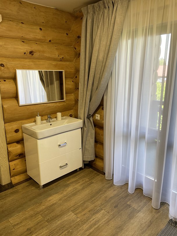 Инфраструктура: шапочки, обливное ведроНа территории шале есть русская баня из рубленного кедра с парной и холодной купелью на улице.