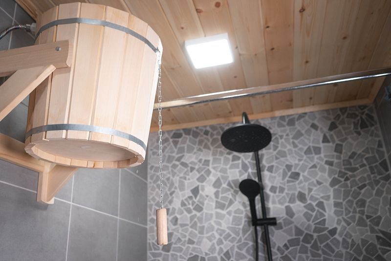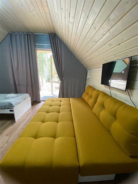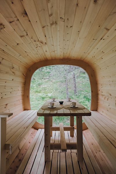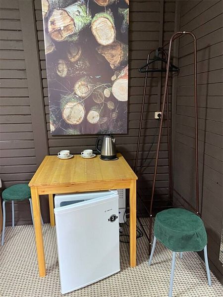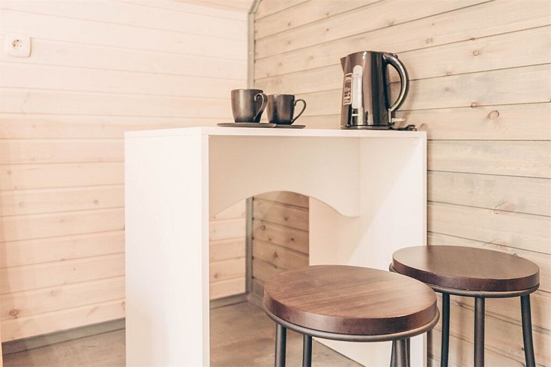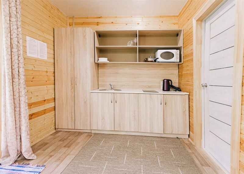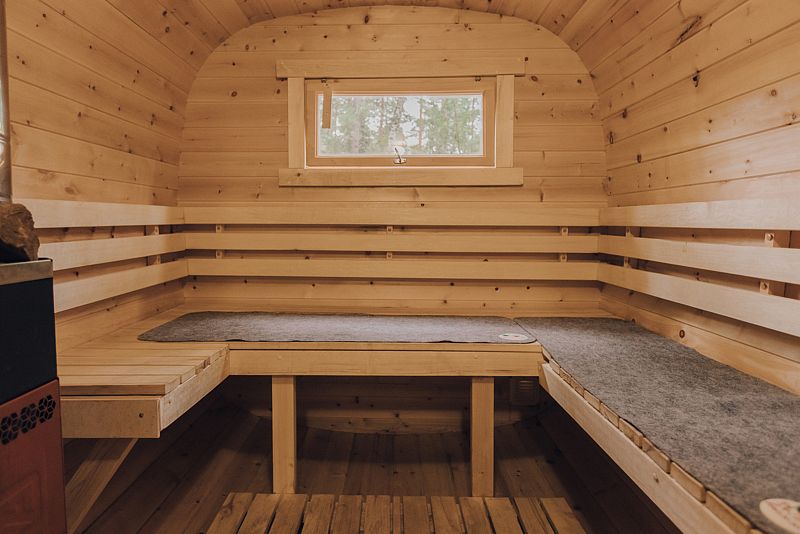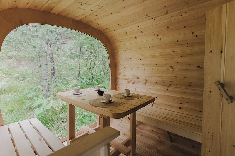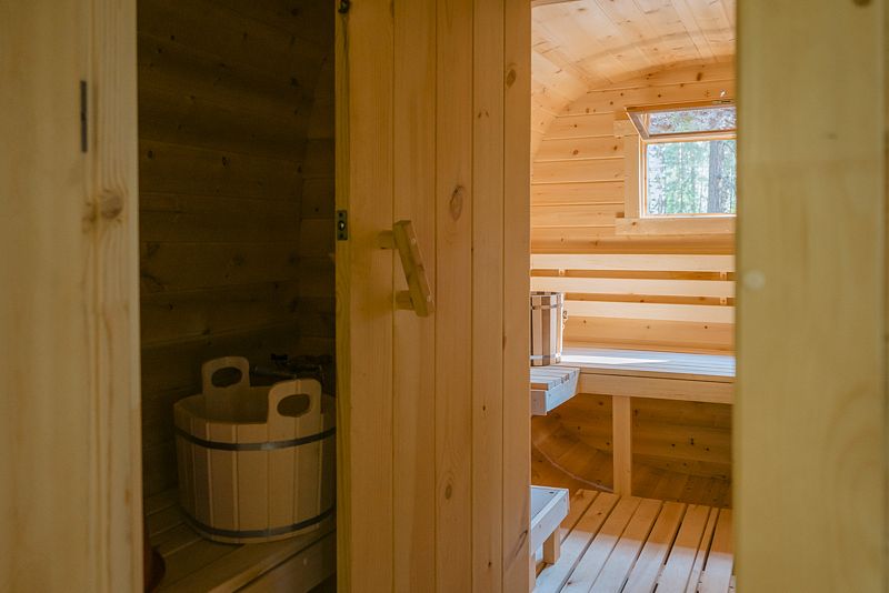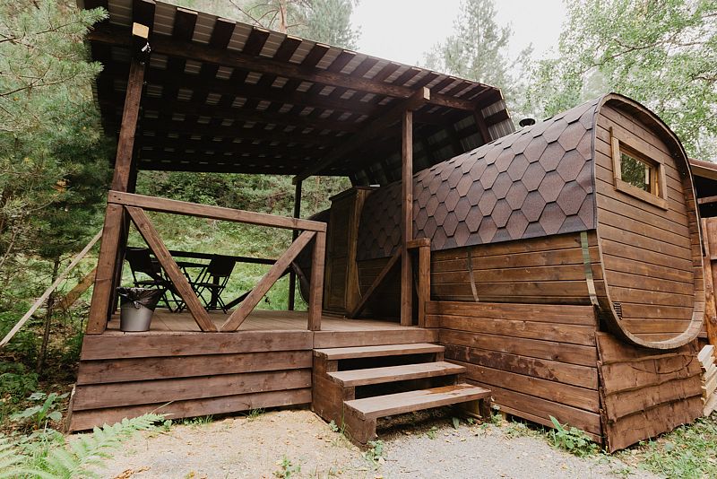 Инфраструктура: зона отдыха, шапочки, душ, березовые веникиУютная летняя баня выполнена в виде продолговатой деревянной бочки. Возможно, с виду она и не выглядит внушительно, однако, в ней умещается парная, мойка и уютная комната отдыха с панорамным окном, в которой можно выпить травяной чай с натуральным алтайским мёдом, глядя на таежный лес.