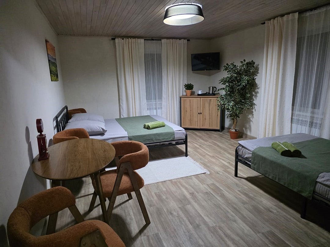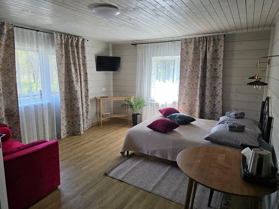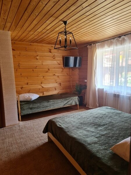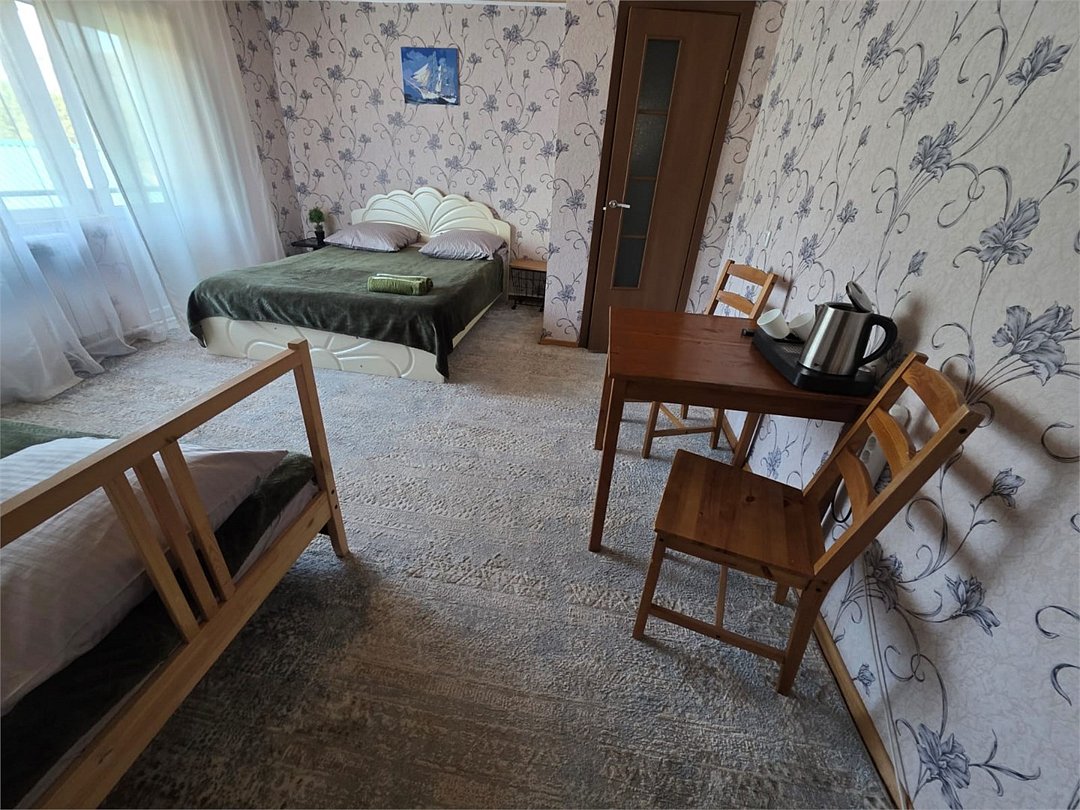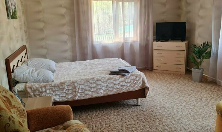 Просторный и светлый номер. Количество мест: 4 Санузел и душ в номере. Чистое пастельное белье Уборка номера каждые 3 дня. Wi-Fi , телевизор В вашем распоряжении открытая беседка с кухней, холодильником, посудой и мангальной зоной Просторная парковка на территории гостевого домаУслуги и удобства