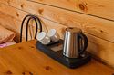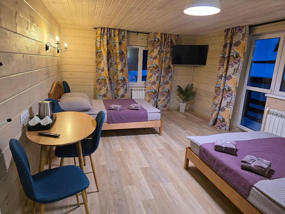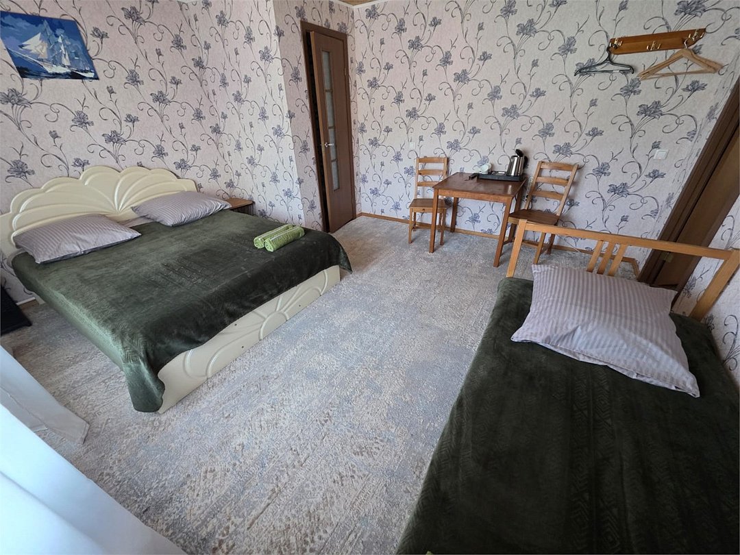 Номер в отапливаемом гостевом доме. Двуспальная и односпальная кровати, телевизор, чайник, стол, с/у с душем.