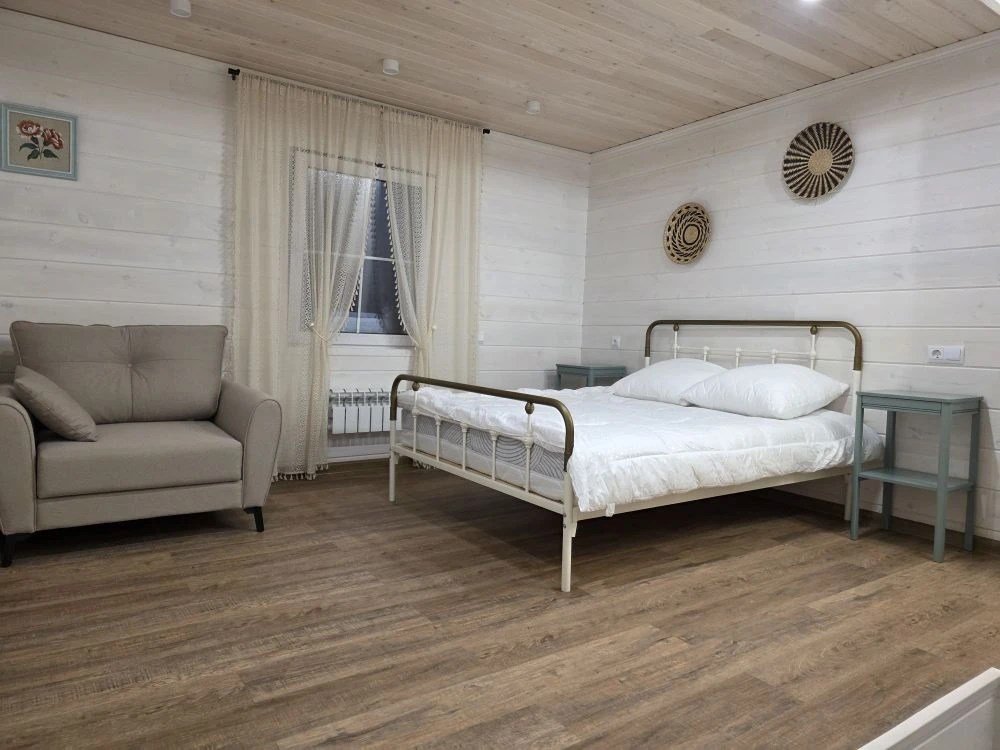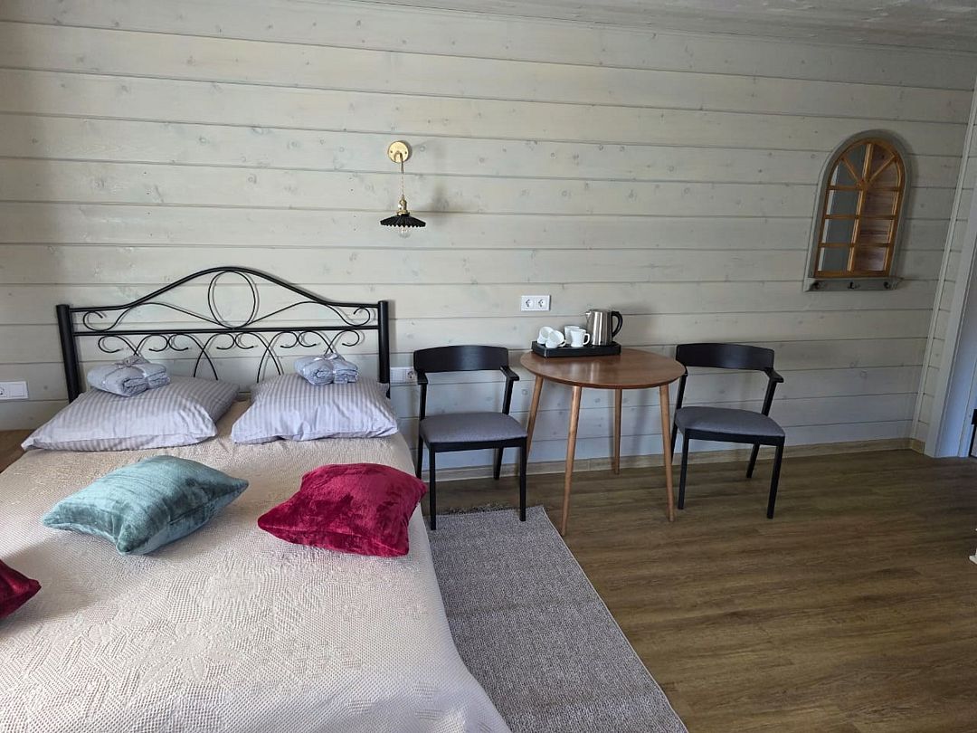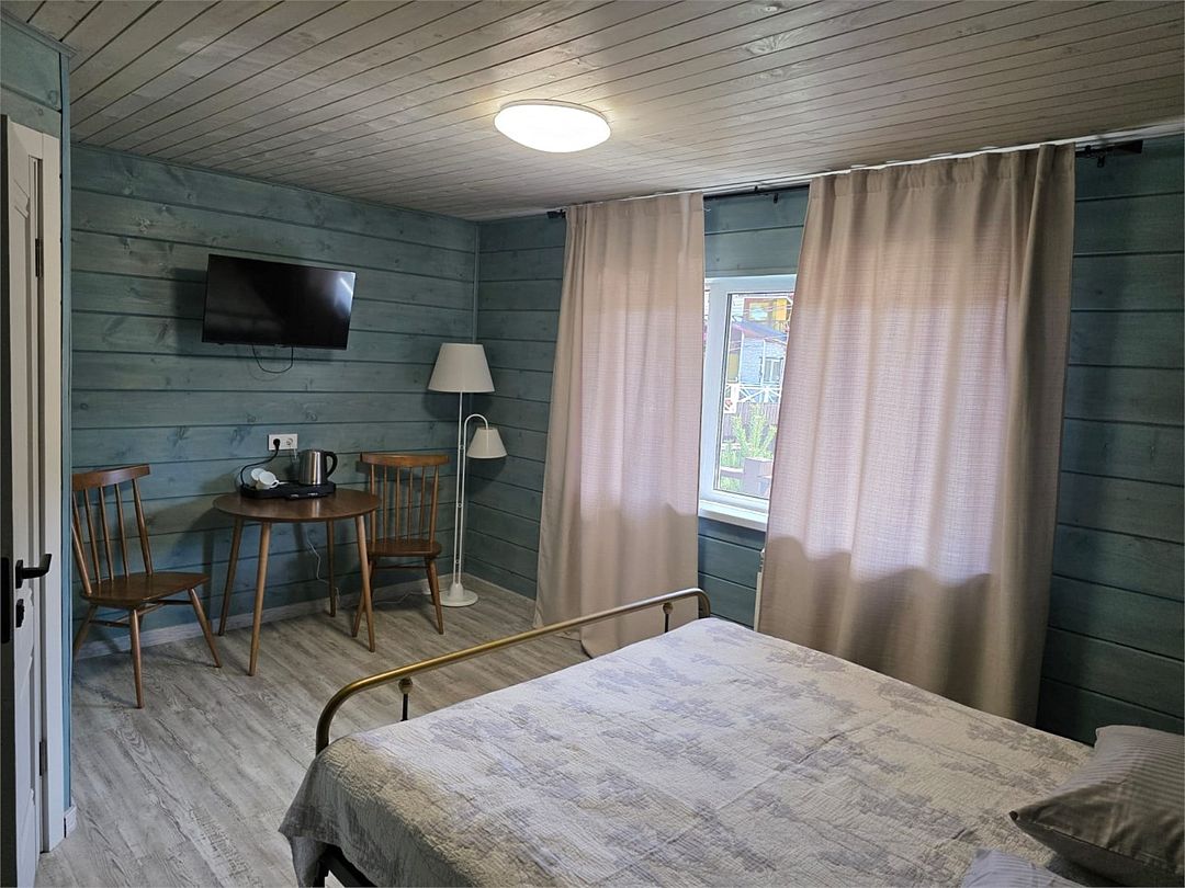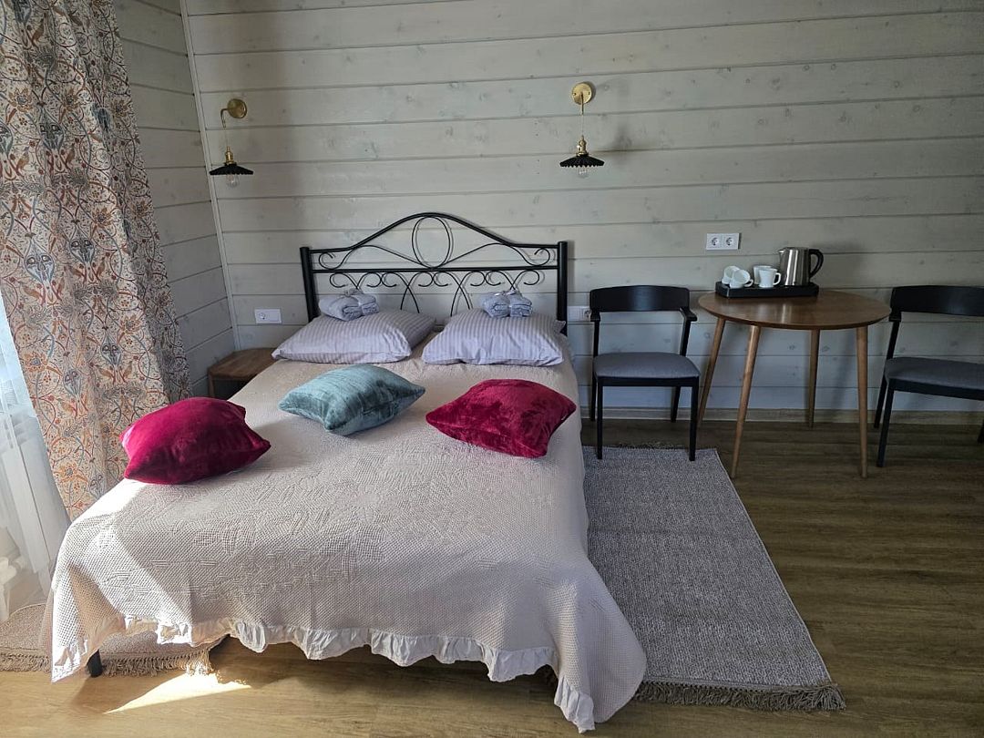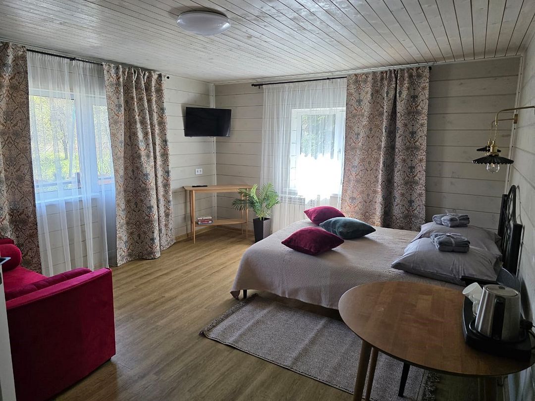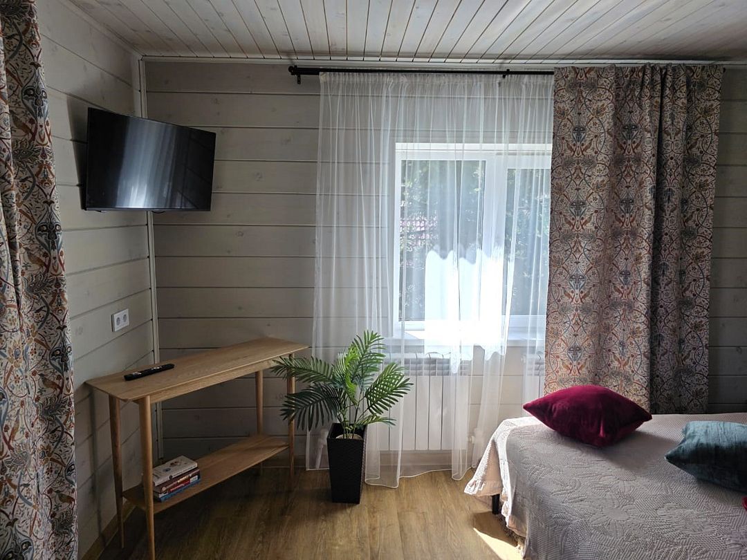 Отдельный вход. Окна в пол. Кухня в номере. Санузел с душем в номере. Чистое постельное белье. Уборка номера каждые 3 дня. Wi-Fi, телевизор. Просторная парковка на территории гостевого дома.