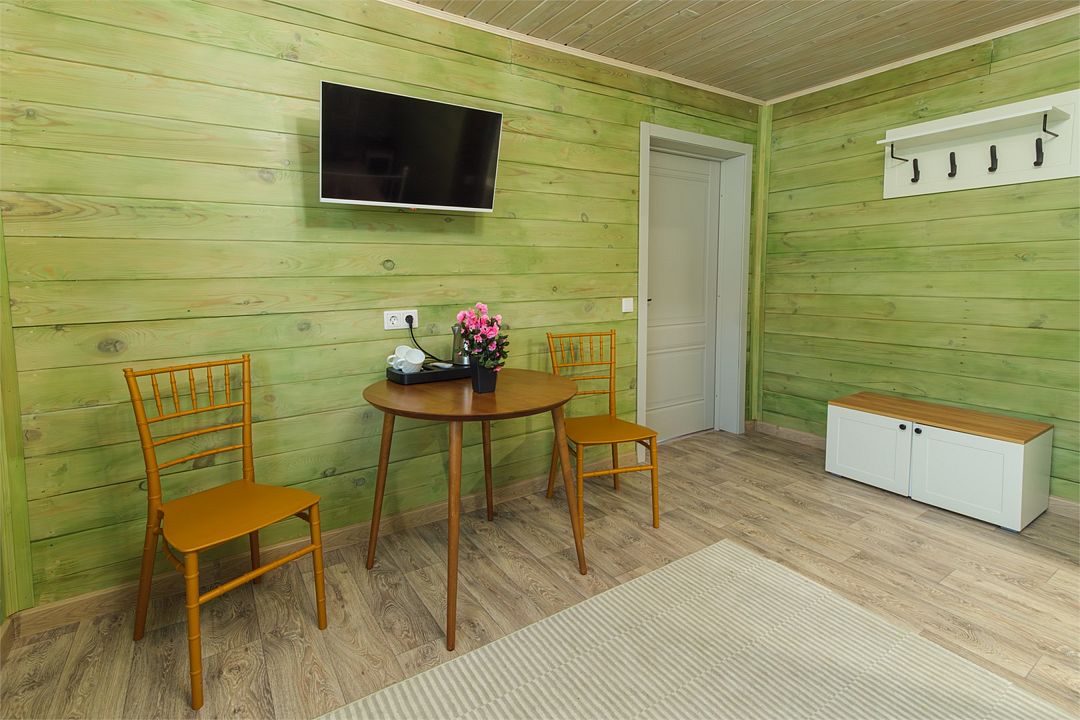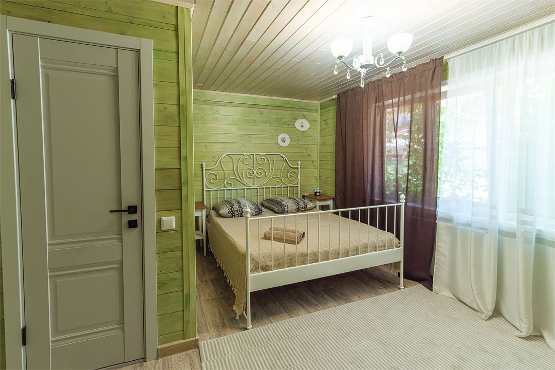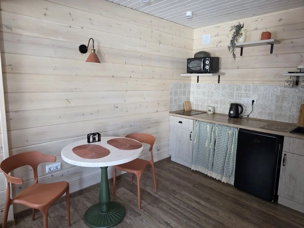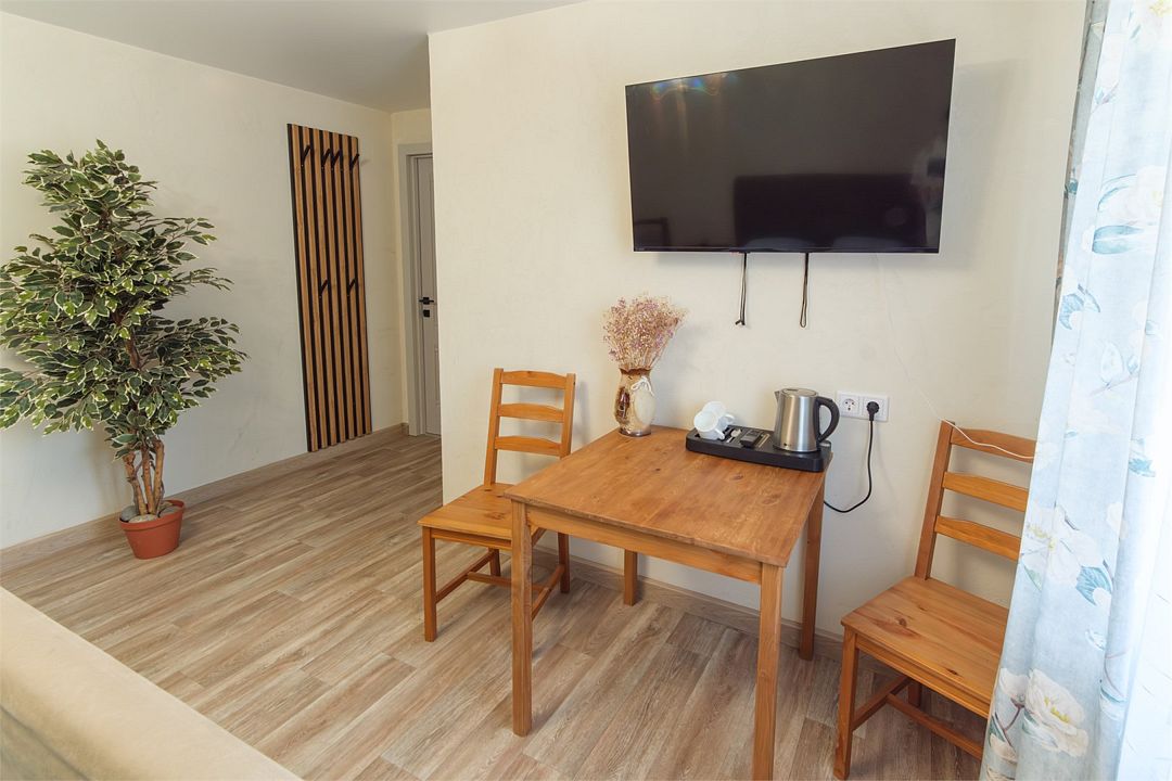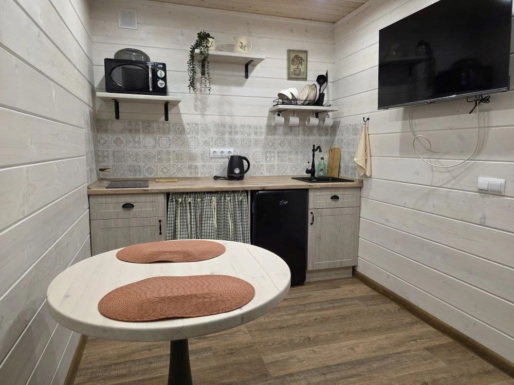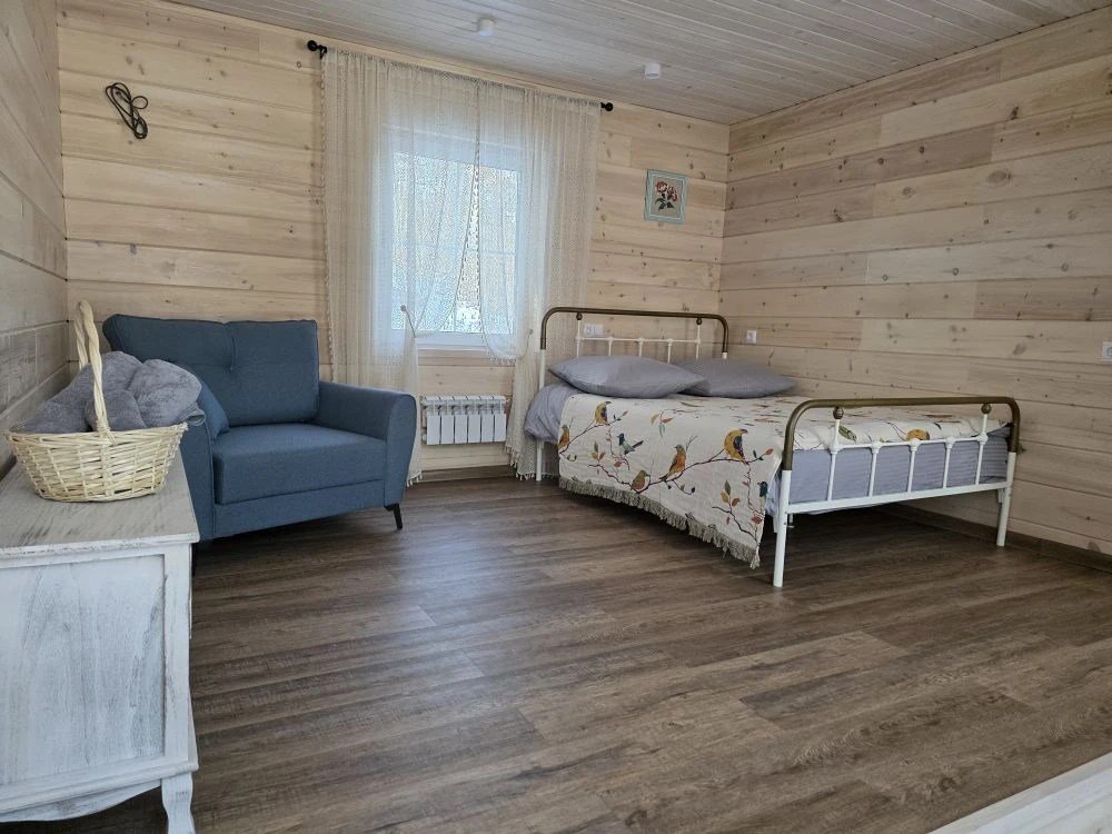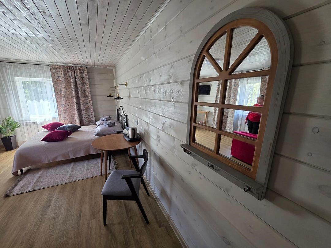 Отдельный вход. Окна в пол. Кухня в номере. Санузел с душем в номере. Чистое постельное белье. Уборка номера каждые 3 дня. Wi-Fi, телевизор. Просторная парковка на территории гостевого дома.