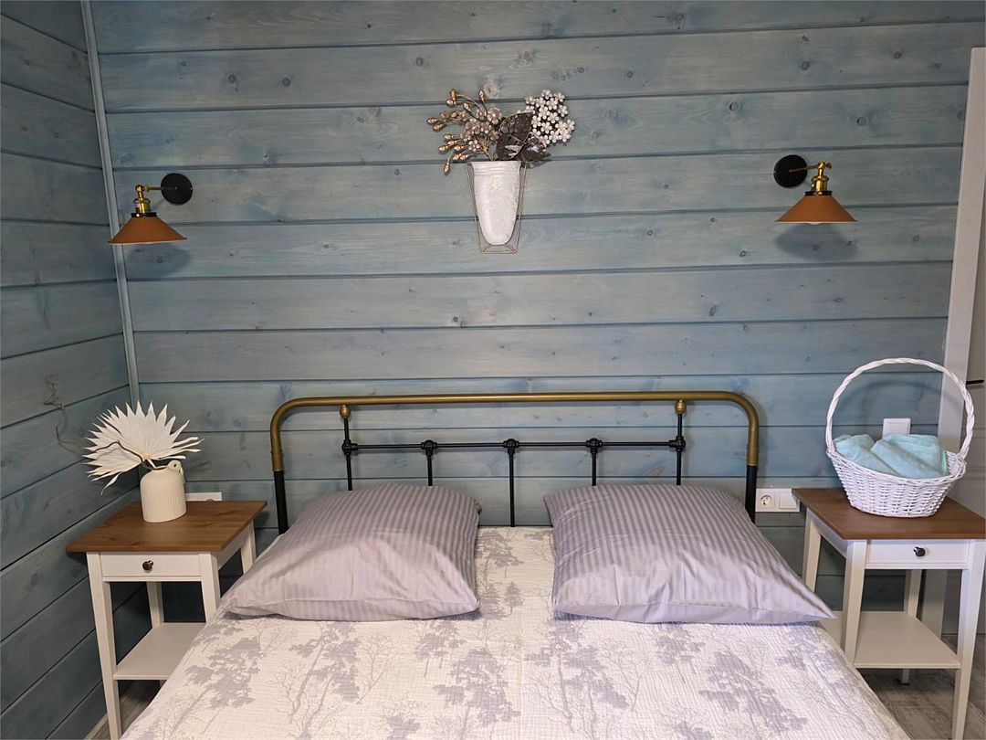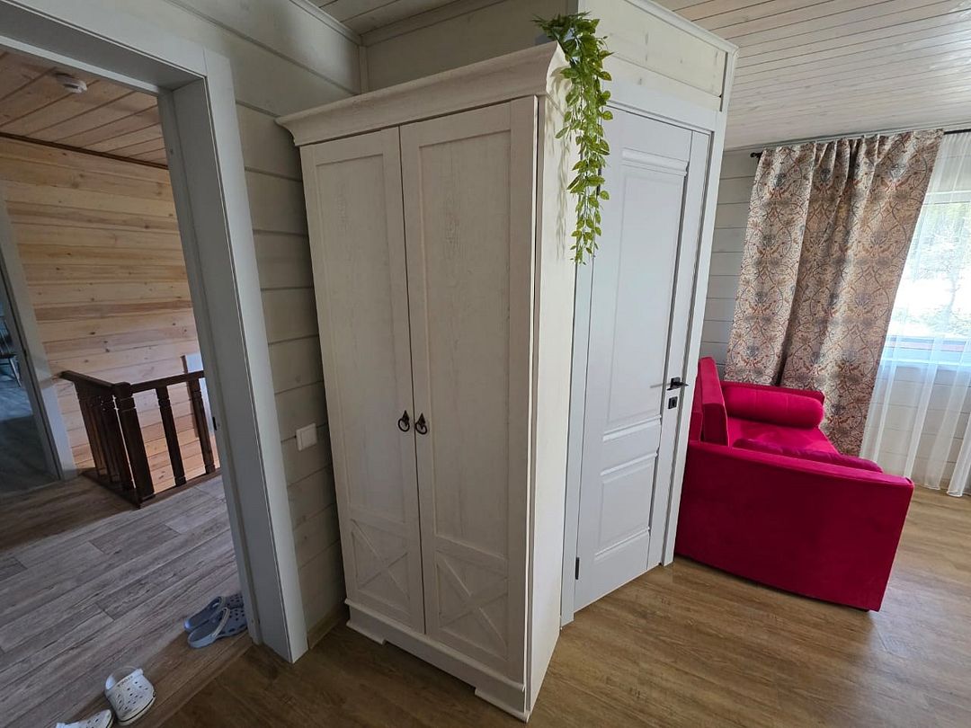 Отдельный вход. Окна в пол. Двухуровневый номер. Личная кухня в номере с чайником, холодильником и кухонной утварью. Санузел с душем в номере. Чистое постельное белье. Уборка номера каждые 3 дня. Wi-Fi, телевизор. Просторная парковка на территории гостевого дома.