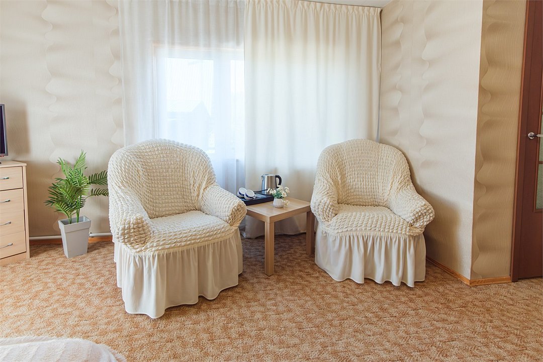 Для размещения в отеле предусмотрены 16 номеров. В трехэтажном теплом доме созданы все условия для комфортного проживания: санузел с душем на каждом этаже, в большинстве комнаты имеют собственную уборную комнату в номере, чистое постельное белье, уборка номера каждые 3 дня.