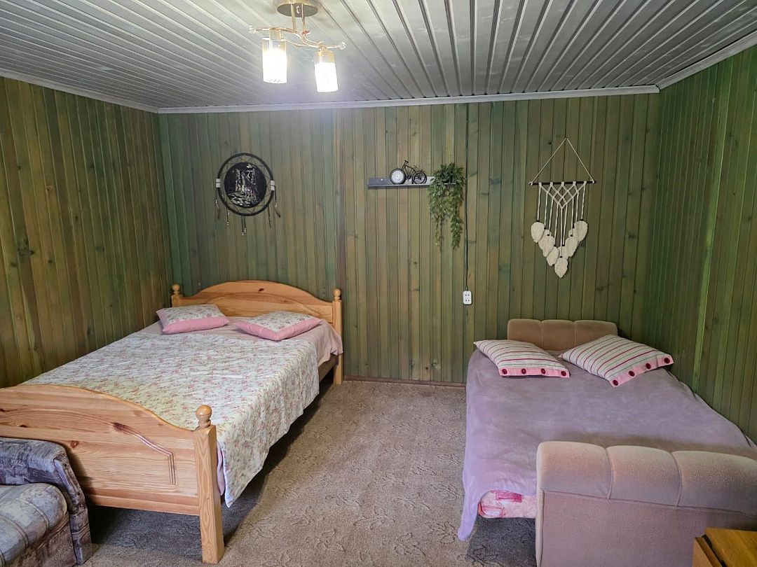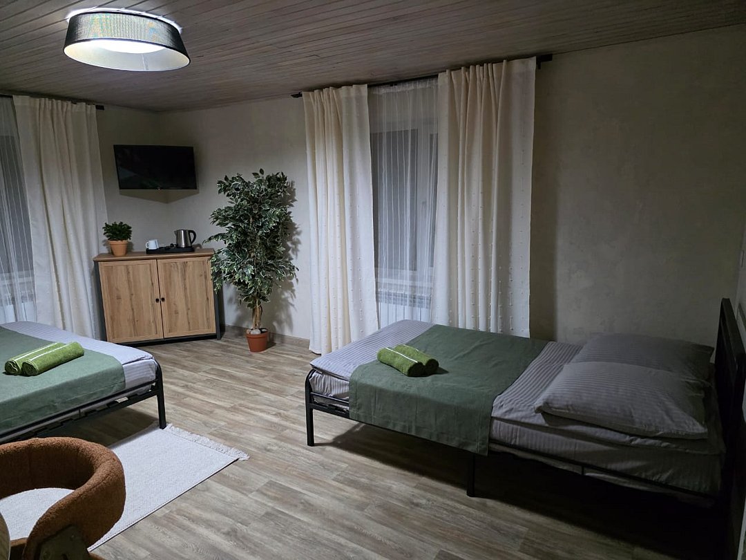 Номер в отапливаемом гостевом доме. Две двуспальные кровати / двуспальная кровать и раскладной диван, телевизор, чайник, стол, с/у с душевой.