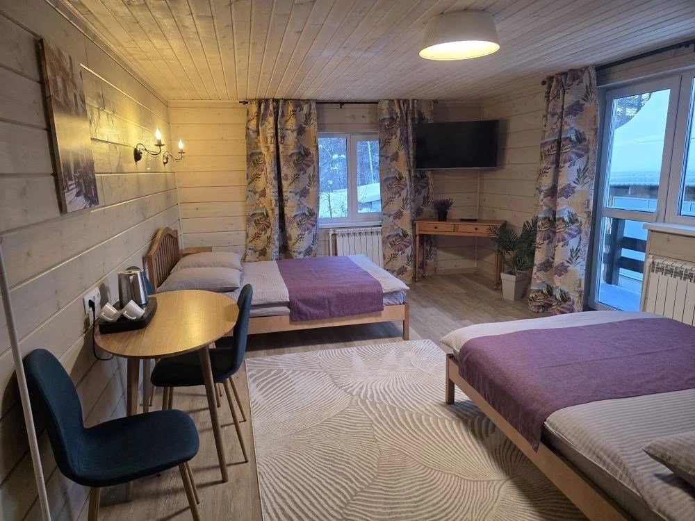 Количество мест: 4. Санузел с душем и раковиной в номере. Чистое постельное белье. Уборка номера каждые 3 дня. Wi-Fi, телевизор. На первом этаже гостевого дома расположена комната для хранения спортивного инвентаря (лыж, сноуборда) с современным модулем для сушки обуви. В вашем распоряжении открытая беседка с кухней, холодильником, посудой и мангальной зоной (в зимний период кухня располагается в гостевом доме) Просторная парковка на территории гостевого дома.