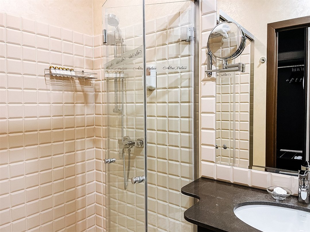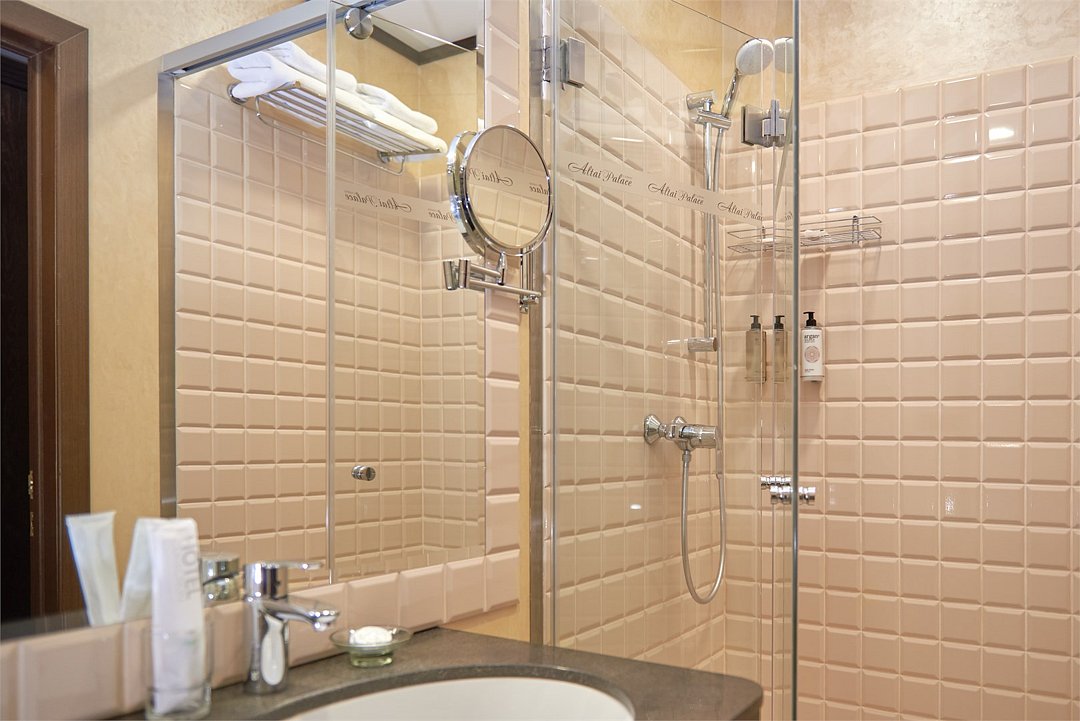 Сьют «Венеция» состоит из 3 комнат: гостиная, спальня и кабинет. В спальне - большая двуспальная кровать. В гостиной и кабинете двуспальные диван-кровати. В декоре номера и его отделке использованы натуральные камни, антикварные предметы интерьера. Номера оборудованы кондиционером, сейфом, спутниковым телевидением, телефоном, Wi-Fi, письменным столом со стулом. Ванные комнаты оснащены душевыми кабинами, банными халатами, тапочками и индивидуальными косметическими принадлежностями. В стоимость включено: - услуга "массаж" - 1 раз в 3 дня; - депозит 10 000 руб/сут на питание в ресторане; - Посещение караоке-клуба; - Посещение термокомплекса - 1 час на двоих; - Бильярд; - Трансфер "Аэропорт - Курорт Altai Palace - Аэропорт".Услуги и удобства