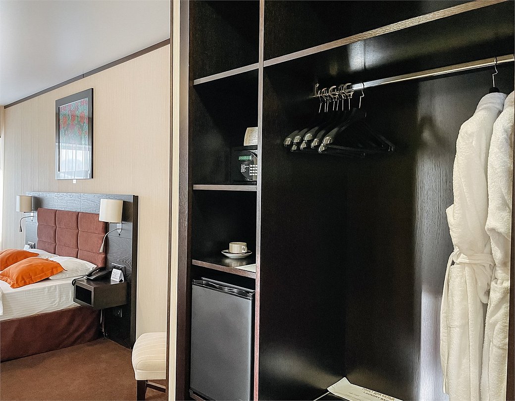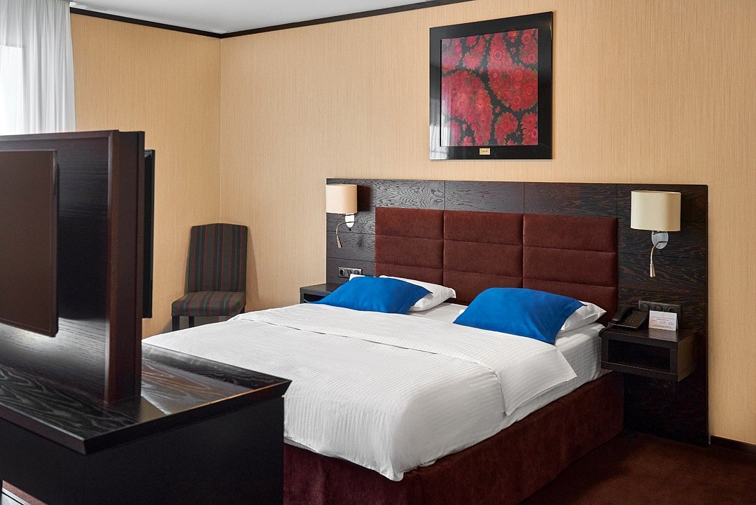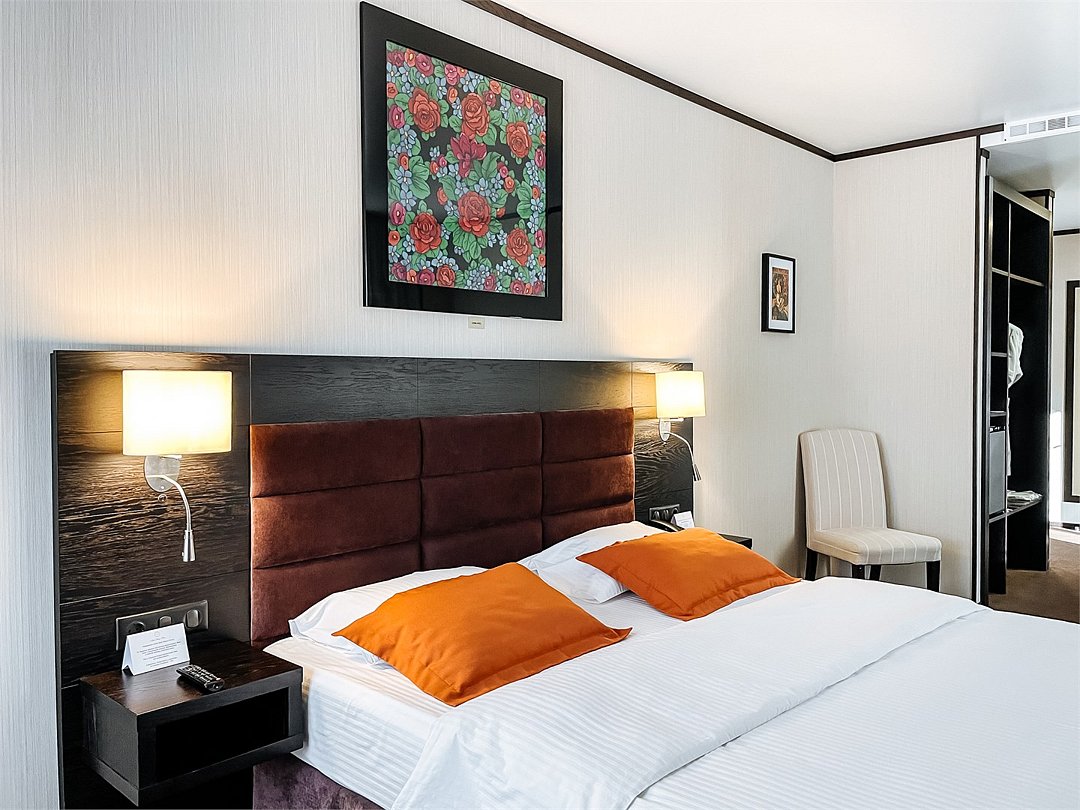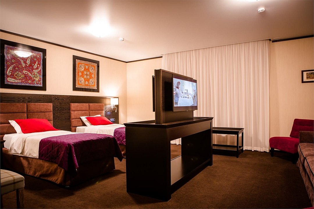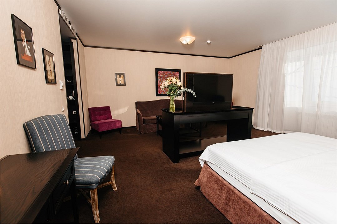 «Люкс» состоит из двух комнат: спальни и гостиной, рассчитан на комфортное размещение до 4 персон. В спальне расположена двуспальная кровать, в гостиной – диван-кровать, кресла и журнальный столик. Номер оборудован кондиционером, сейфом, двумя телевизорами, телефоном, Wi-Fi, письменным столом. Ванная комната оснащена душевой кабиной, банными халатами, полотенцами, тапочками и индивидуальными косметическими принадлежностями.Услуги и удобства