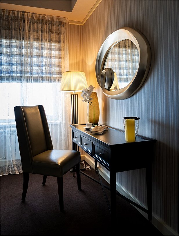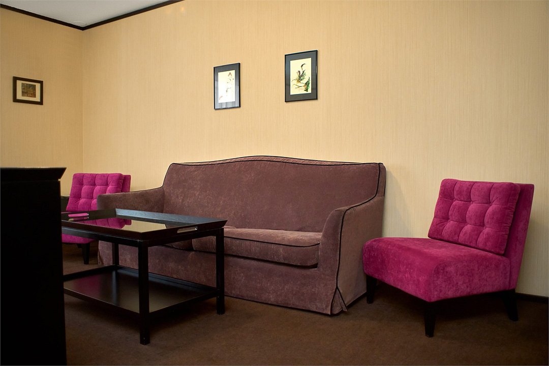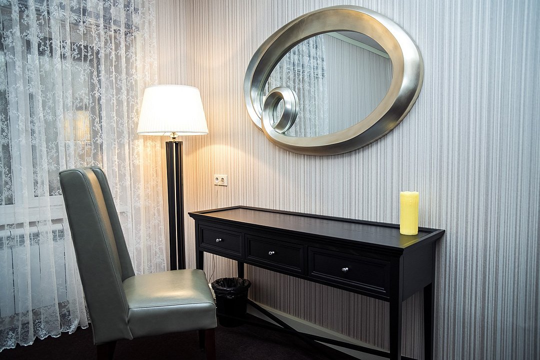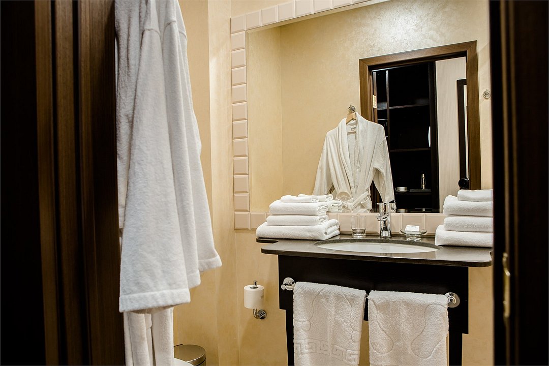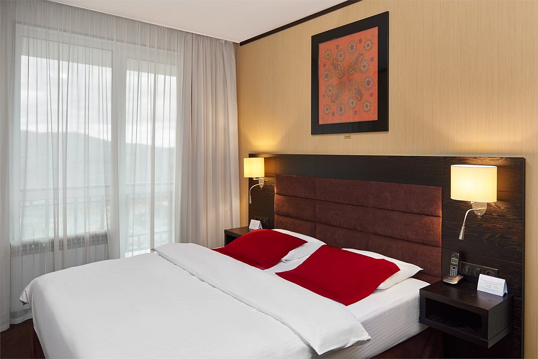 «Люкс» состоит из двух комнат: спальни и гостиной, рассчитан на комфортное размещение до 4 персон. В спальне расположена двуспальная кровать, в гостиной – диван-кровать, кресла и журнальный столик. Номер оборудован кондиционером, сейфом, двумя телевизорами, телефоном, Wi-Fi, письменным столом. Ванная комната оснащена душевой кабиной, банными халатами, полотенцами, тапочками и индивидуальными косметическими принадлежностями.Услуги и удобства