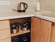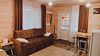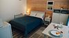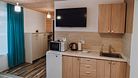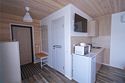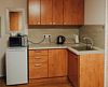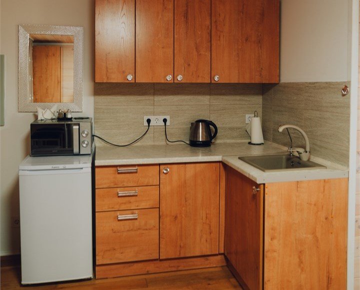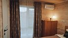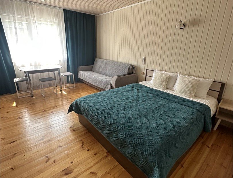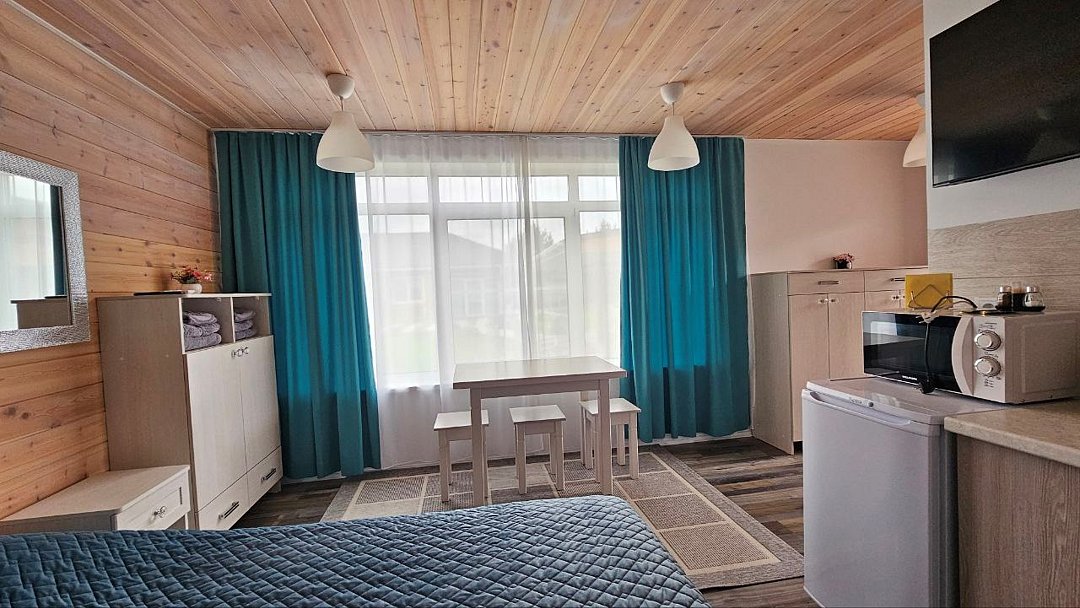 Двуспальная кровать (доп. место раскладушка), телевизор, кондиционер, стол, стулья, оборудованная кухонная зона, холодильник, чайник, микроволновая печь. С/у с душевой.