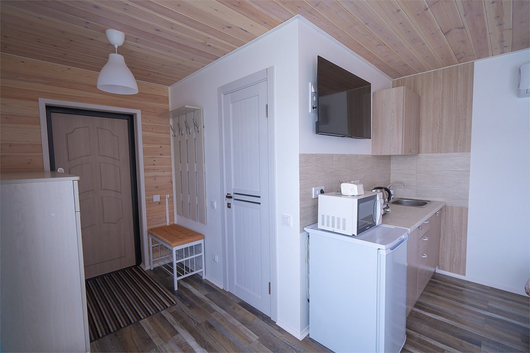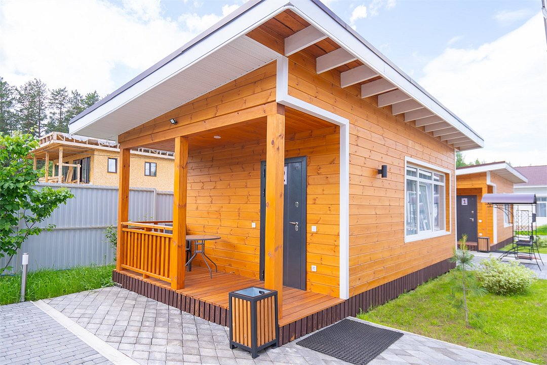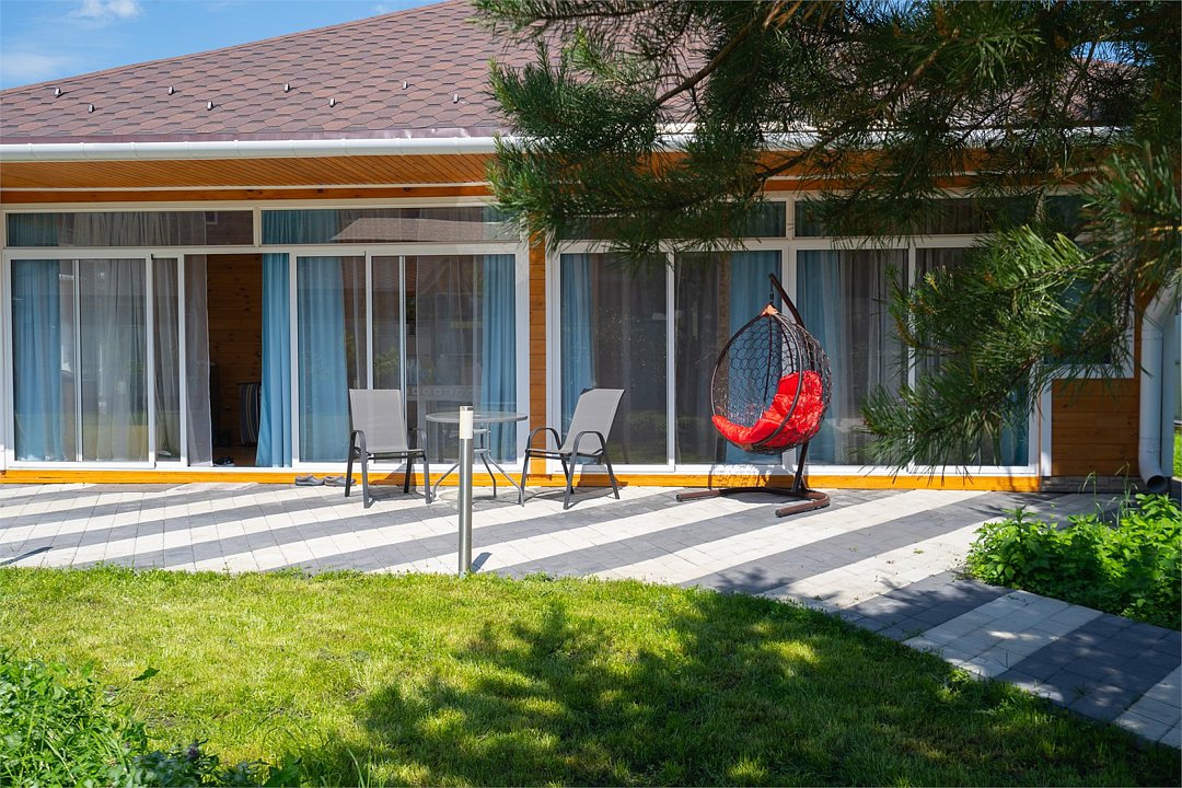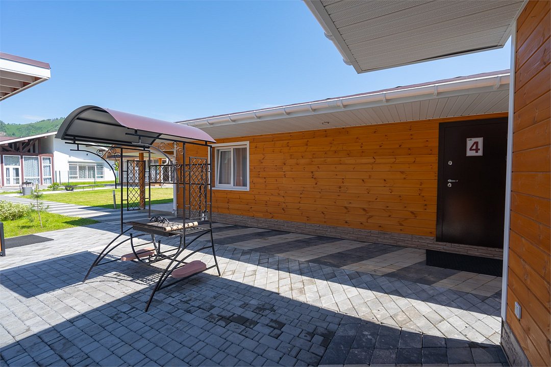 Территория представляет собой ухоженное пространство, сочетающее в себе уют и функциональность. Базу отдыха украшают цветы, деревья, среди зеленых газонов пролегают пешеходные дорожки. Оборудованы мангальные зоны и костровище, создающее в темное время суток особую атмосферу. Для проживания предусмотрены деревянные одноэтажные одно- и двухкомнатные домики различной вместимости. В каждом своя терраса и мангал около нее, кухонная зона с посудой и плитой для самостоятельного приготовления пищи, персональный санузел с душем, халатами и предметами гигиены. Установлены теплые полы, есть кондиционер, сейф.