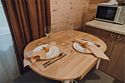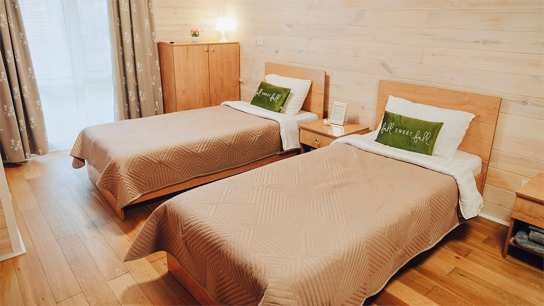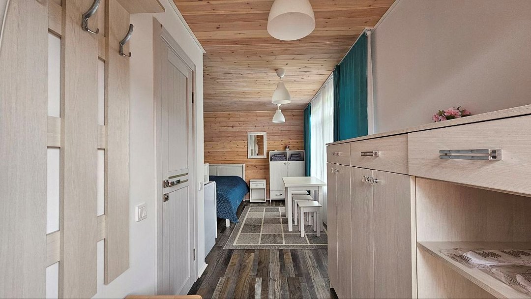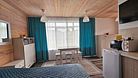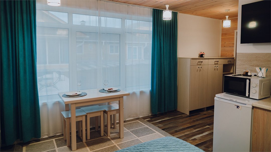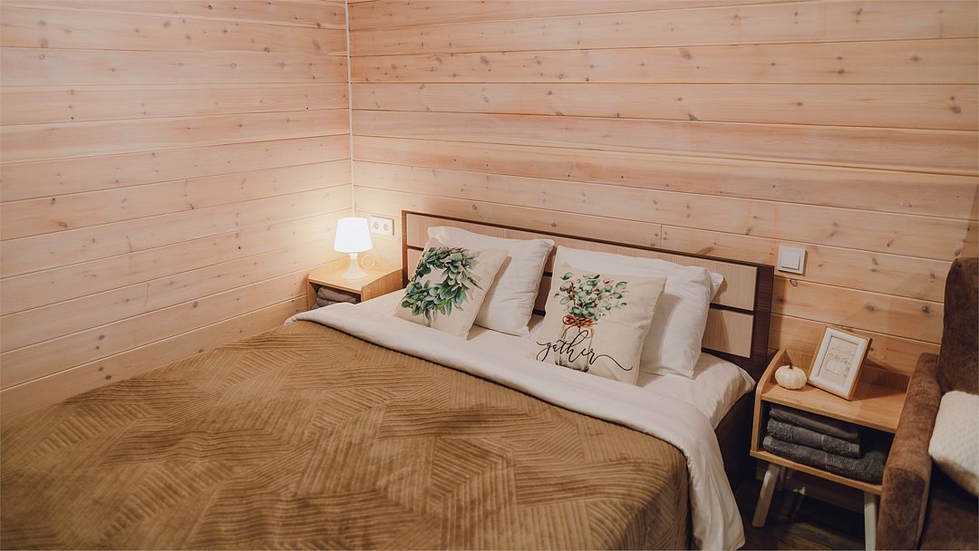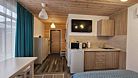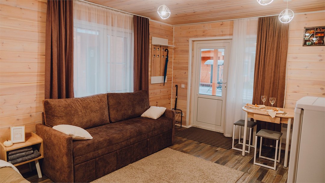 Территория представляет собой ухоженное пространство, сочетающее в себе уют и функциональность. Базу отдыха украшают цветы, деревья, среди зеленых газонов пролегают пешеходные дорожки. Оборудованы мангальные зоны и костровище, создающее в темное время суток особую атмосферу. Для проживания предусмотрены деревянные одноэтажные одно- и двухкомнатные домики различной вместимости. В каждом своя терраса и мангал около нее, кухонная зона с посудой и плитой для самостоятельного приготовления пищи, персональный санузел с душем, халатами и предметами гигиены. Установлены теплые полы, есть кондиционер, сейф.