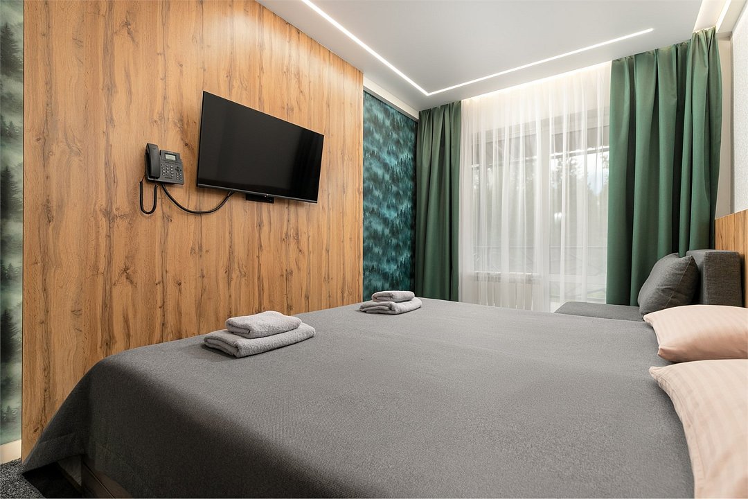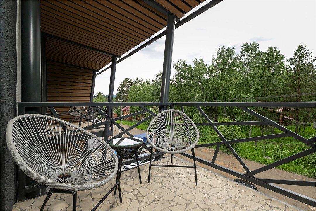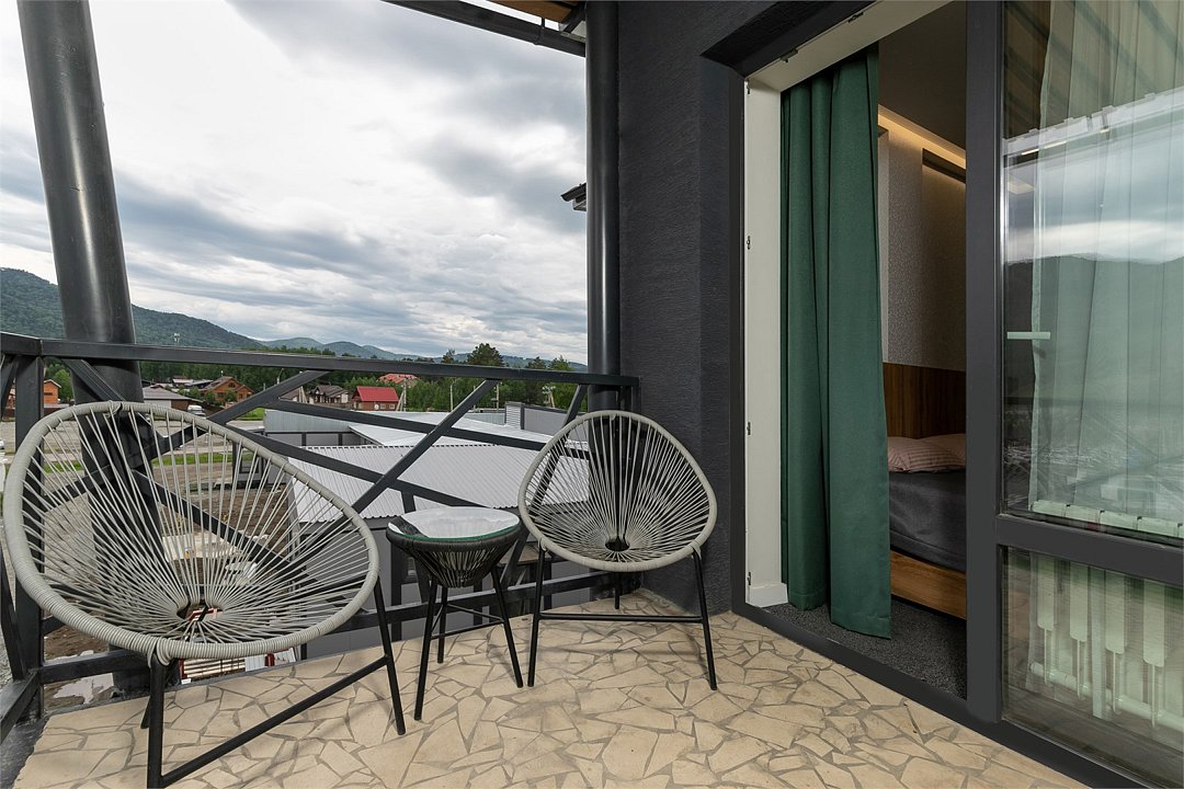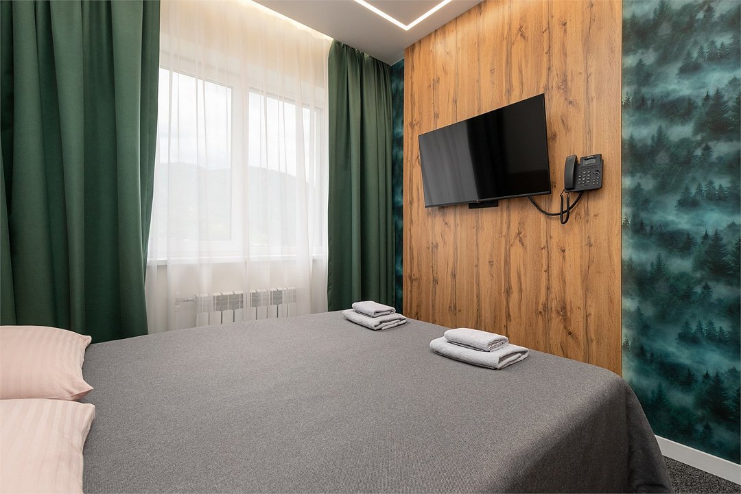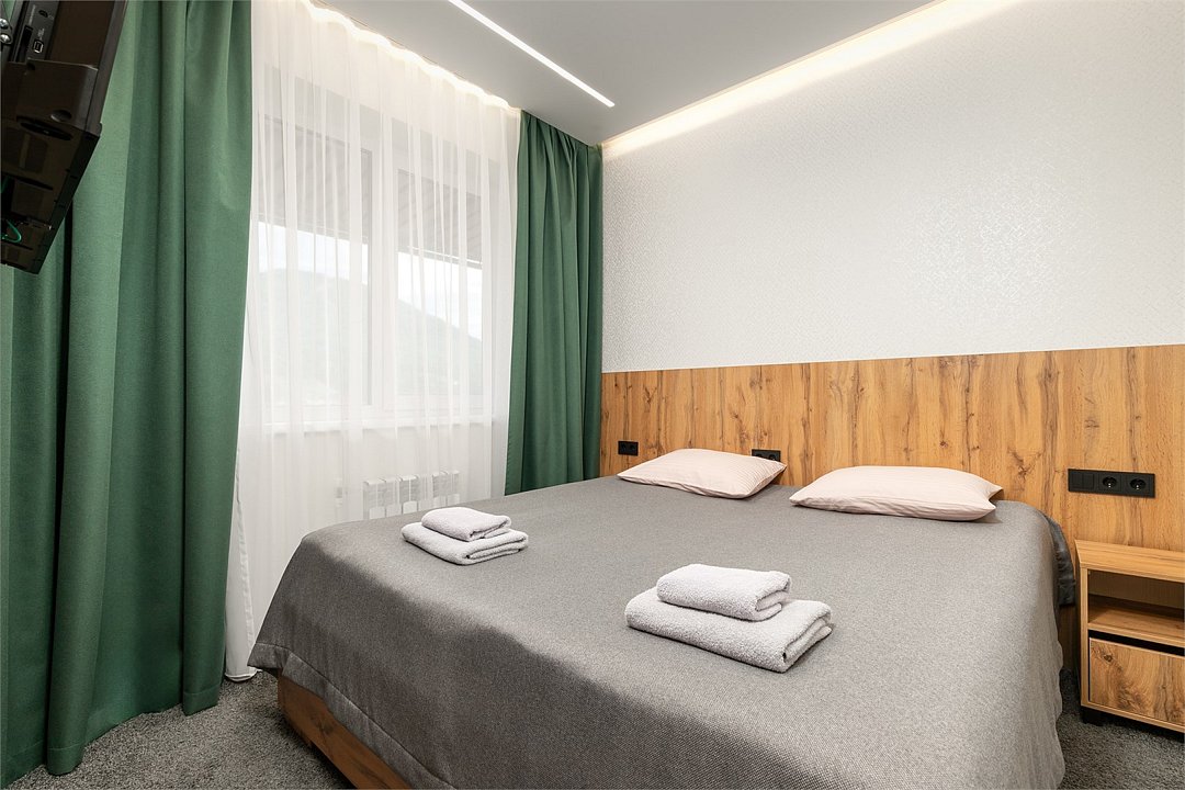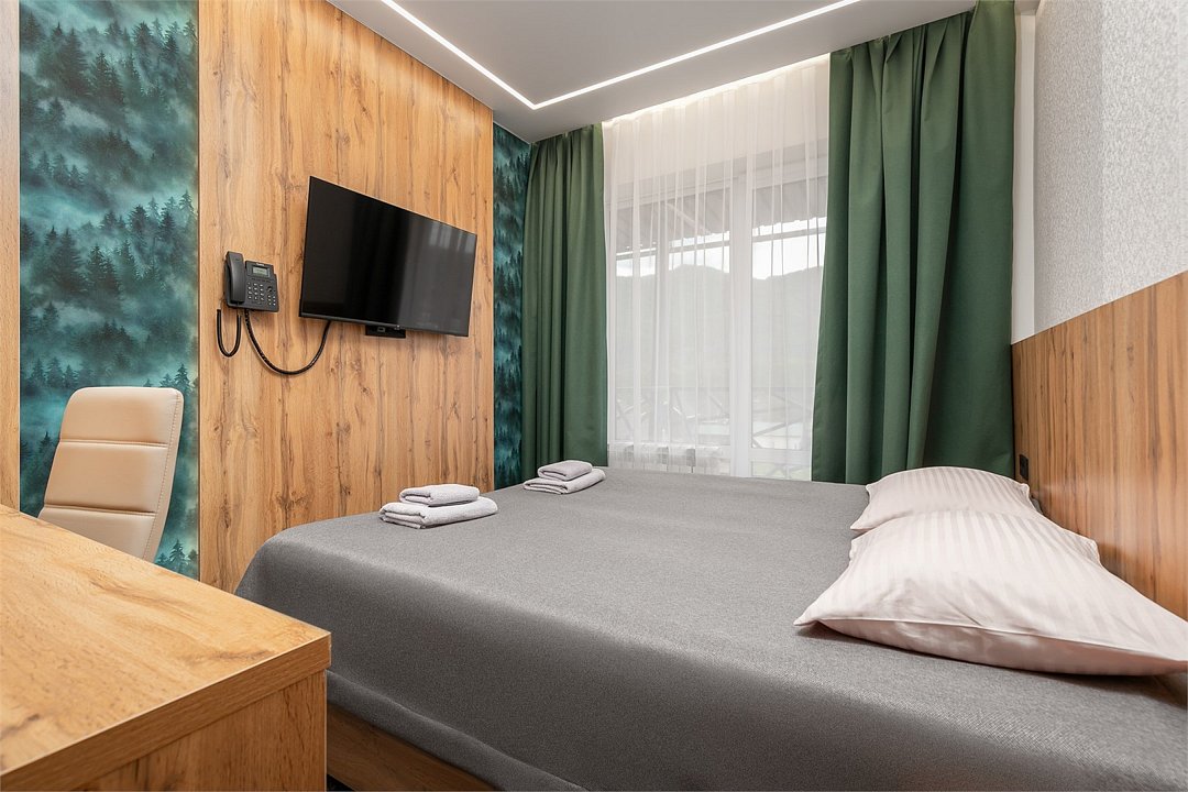 Стандарт улучшенный. Двухместный номер размещен в трехэтажном отеле, представляют собой 1 жилую комнату, отдельную ванную комнату и балкон с красивым видом на горы или лес. В каждом номере есть всё для создания теплой, уютной атмосферы - комфортная двуспальная кровать и мягкое раскладное кресло, прикроватные тумбочки, рабочий стол со стулом, LED-телевизор, IP-телефон, шкаф, пуфик и коврик, зеркало возле стола и на двери в полный рост, полотенца, вешалки. В ванной комнате расположены: тропический и ручной душ, туалет, раковина с зеркалом и тумбой, фен, тапочки и средства для личной гигиены – весь набор для того, чтобы с утра с отличным настроением подняться навстречу новым приключениям! На первом этаже в отеле находится оборудованная кухня, обеденная зона, кофемашина, кулер, мангальная зона, зона для отдыха, конференц зона, детский угол. Так же отель предоставляет услуги прачечной за дополнительную оплату. Своя бесплатная парковка.Услуги и удобства