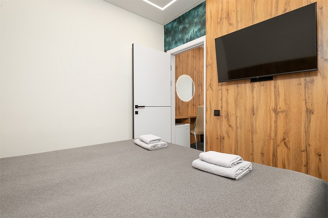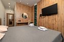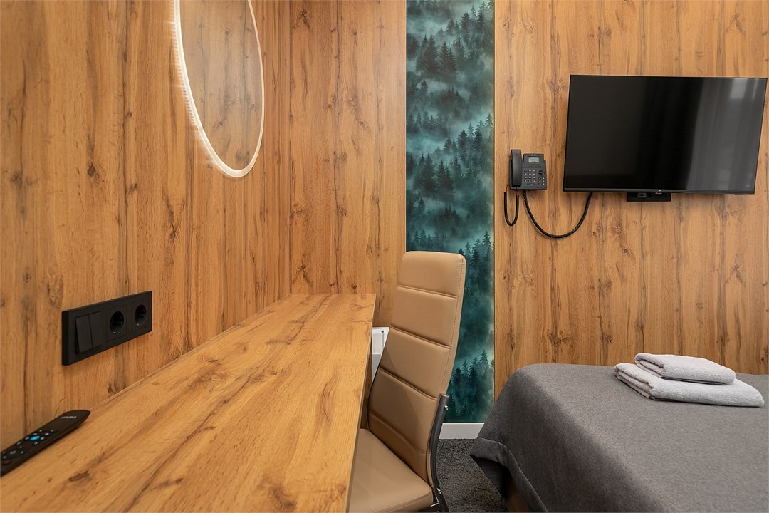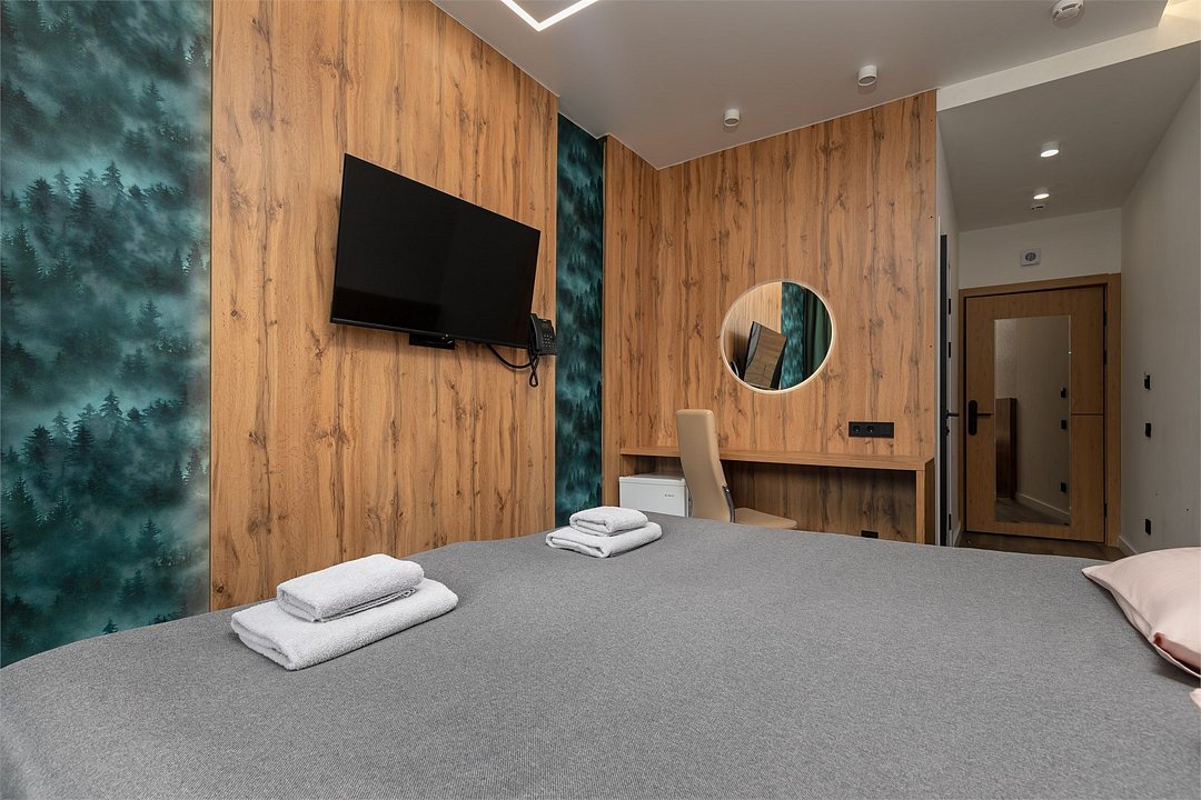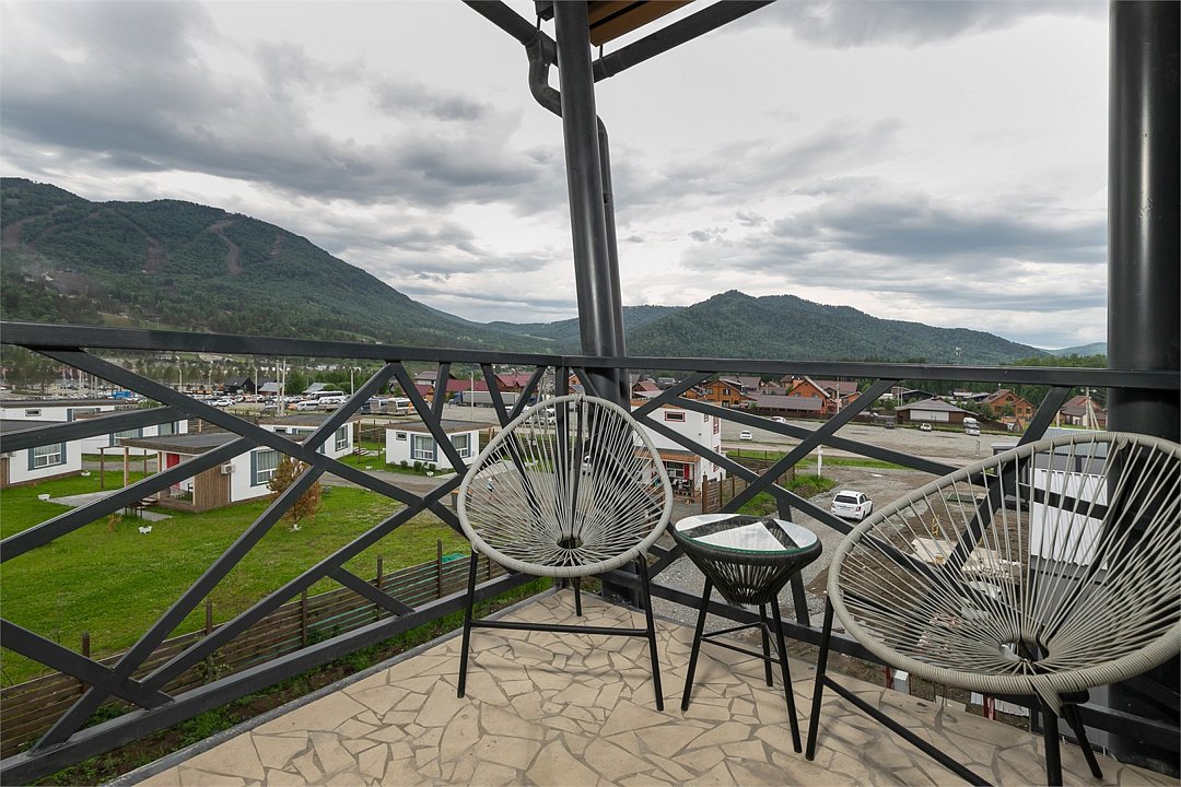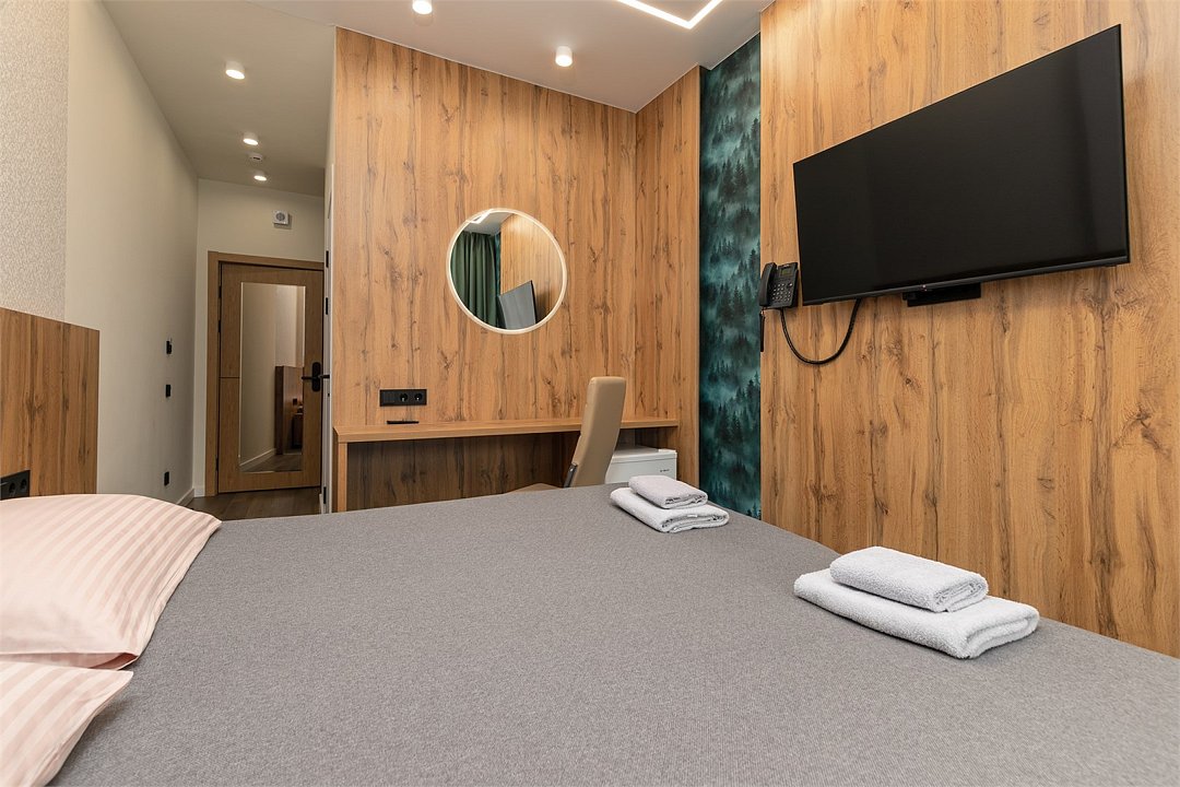 Стандарт улучшенный. Двухместный номер размещен в трехэтажном отеле, представляют собой 1 жилую комнату, отдельную ванную комнату и балкон с красивым видом на горы или лес. В каждом номере есть всё для создания теплой, уютной атмосферы - комфортная двуспальная кровать и мягкое раскладное кресло, прикроватные тумбочки, рабочий стол со стулом, LED-телевизор, IP-телефон, шкаф, пуфик и коврик, зеркало возле стола и на двери в полный рост, полотенца, вешалки. В ванной комнате расположены: тропический и ручной душ, туалет, раковина с зеркалом и тумбой, фен, тапочки и средства для личной гигиены – весь набор для того, чтобы с утра с отличным настроением подняться навстречу новым приключениям! На первом этаже в отеле находится оборудованная кухня, обеденная зона, кофемашина, кулер, мангальная зона, зона для отдыха, конференц зона, детский угол. Так же отель предоставляет услуги прачечной за дополнительную оплату. Своя бесплатная парковка.Услуги и удобства