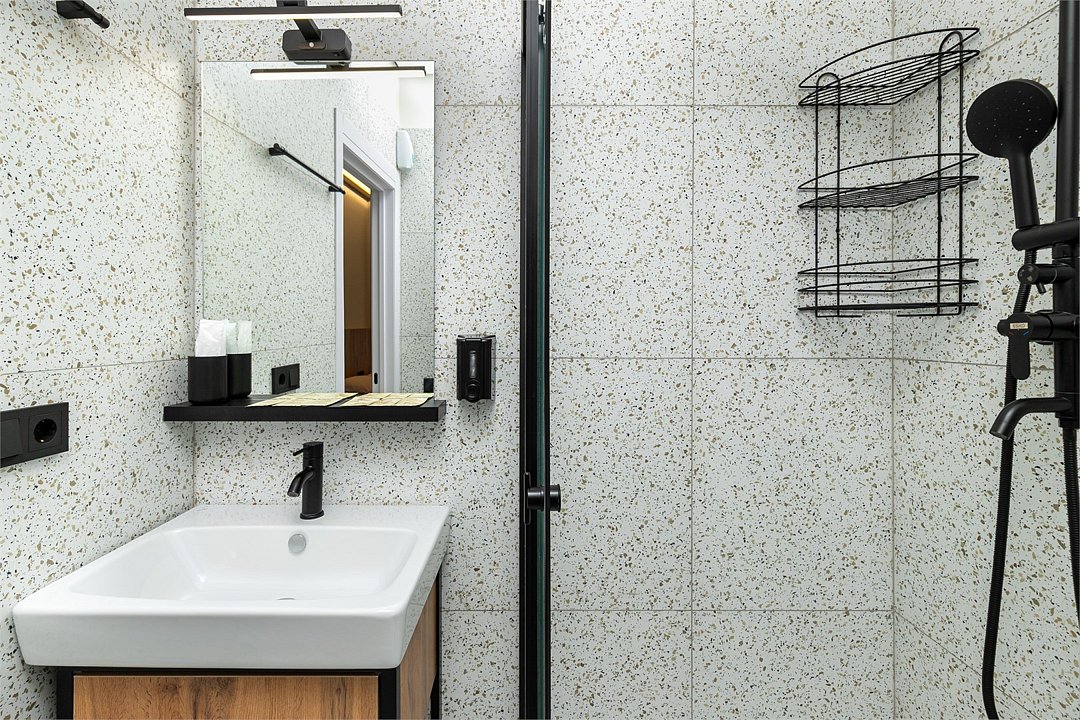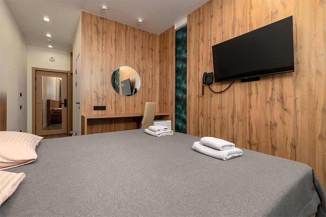 Стандартные двухместные номера размещены в трехэтажном отеле, представляют собой 1 жилую комнату в 18 кв.м. Комфортные спальные места с двуспальными кроватями, прикроватными тумбочками, рабочий стол со стулом, LED-телевизор, IP-телефон, шкаф, пуфик и коврик, зеркало возле стола в ванной и на двери в полный рост, полотенца, вешалки. В каждом номере свой санузел, в котором расположены: тропический и ручной душ, туалет, раковина с тумбой, фен, тапочки и средства для личной гигиены – весь набор для того, чтобы с утра с отличным настроением подняться навстречу новым приключениям! На первом этаже в отеле находится оборудованная кухня, обеденная зона, кофемашина, кулер, мангальная зона, зона для отдыха, конференц зона, детский угол. Так же отель предоставляет услуги прачечной за дополнительную оплату. Своя бесплатная парковка.Услуги и удобства
