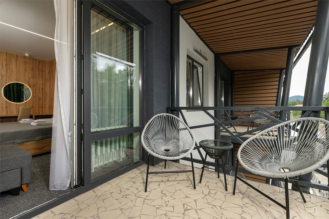 «Люкс» двухместные номера размещены в трехэтажном отеле, представляют собой 1 просторную комнату, ванную комнату и балкон в 24 кв.м. В каждой номере предоставлены все необходимые условия для создания уютной и теплой обстановки - комфортная двуспальная кровать, раскладное мягкое кресло и балкон с прекрасным видом на лес, балкон с прекрасным видом на горы или лес, прикроватные тумбочки, рабочий стол со стулом, LED-телевизор, IP-телефон, шкаф, пуфик и коврик, зеркало возле стола и на двери в полный рост, полотенца, вешалки. В каждом своя ванная комната в котором расположены: тропический и ручной душ, туалет, раковина с зеркалом и тумбой, фен, тапочки и средства для личной гигиены – Весь комплект для того, чтобы с утра в хорошем расположении духа встать и отправиться на встречу новым возможностям! На первом этаже в отеле находится оборудованная кухня, обеденная зона, кофемашина, кулер, мангальная зона, зона для отдыха, конференц зона, детский угол. Так же отель предоставляет услуги прачечной за дополнительную оплату. Своя бесплатная парковка.Услуги и удобства