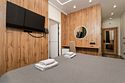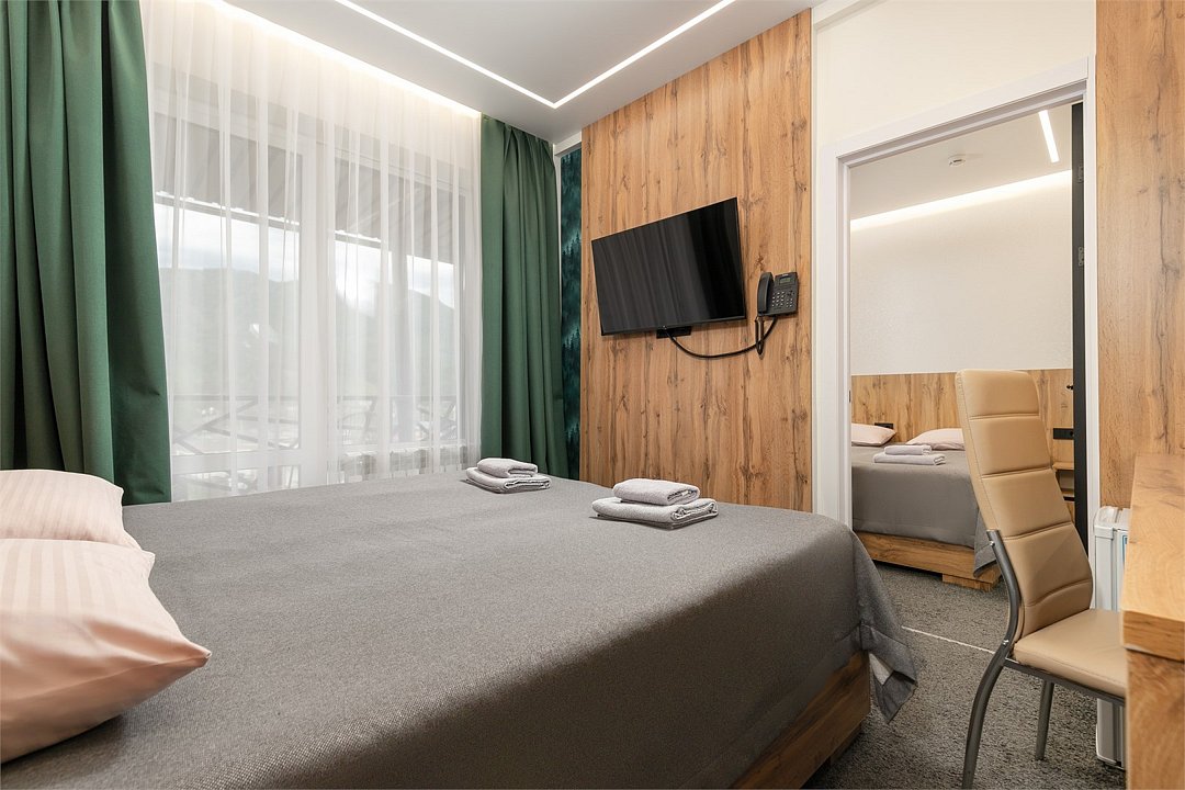 "Люкс" пятиместный номера размещены в трехэтажном отеле, представляют собой 2 комнату в 58кв.м. В каждом номере есть всё для создания семейной теплой, уютной атмосферы - два комфортных двуспальных места и одна полуторная кровать, балкон с прекрасным видом на горы или лес, прикроватные тумбочки, рабочий стол со стулом, два LED-телевизор, IP-телефон, 2 шкафа, пуфик и коврик, зеркало возле стола и на двери в полный рост, полотенца, вешалки. Своя ванная комната в которой расположены: тропический и ручной душ, туалет, раковина с зеркалом и тумбой, фен, тапочки и средства для личной гигиены – весь набор для того, чтобы с утра с отличным настроением подняться навстречу новым приключениям! На первом этаже в отеле находится оборудованная кухня, обеденная зона, кофемашина, кулер, мангальная зона, зона для отдыха, конференц зона, детский угол. Так же отель предоставляет услуги прачечной за дополнительную оплату. Своя бесплатная парковка.Услуги и удобства