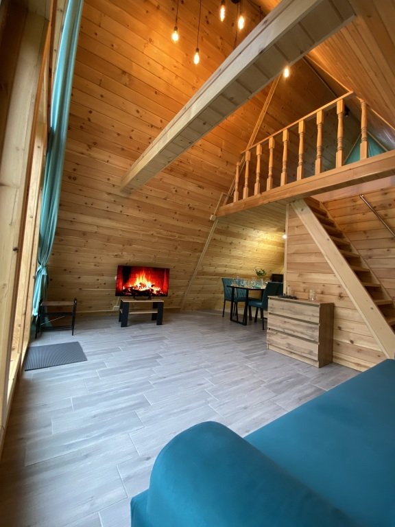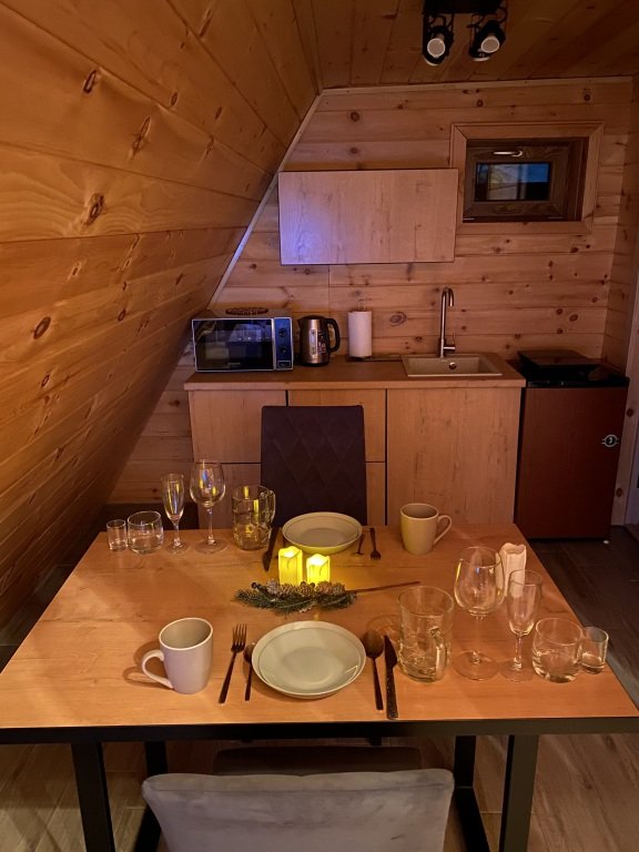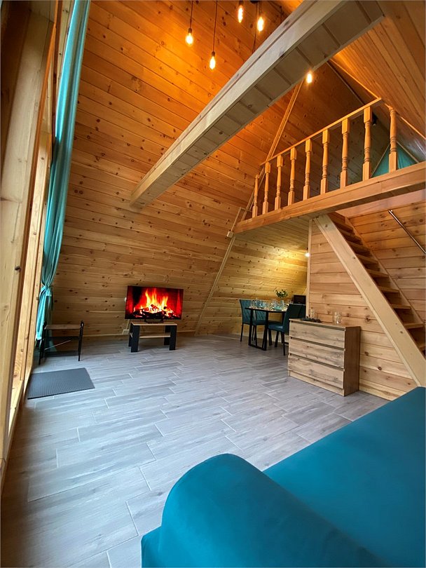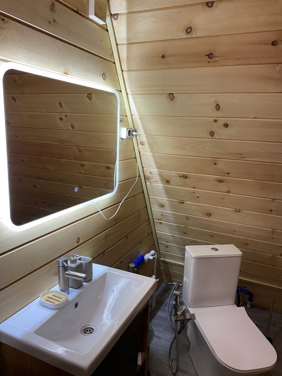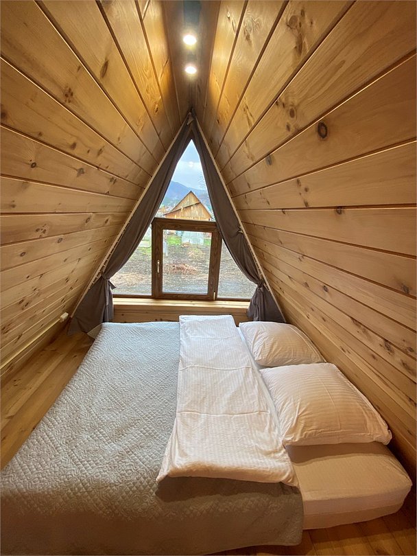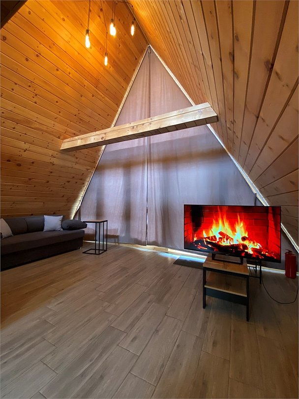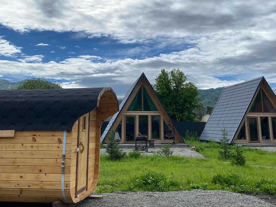 На территории базы находятся два уютных дома в стиле А-фрейм с отделкой экологически чистыми материалами, оборудованных всем необходимым для комфортного проживания. Домики с панорамными окнами включают кухню, оснащенную бытовой техникой, телевизор с голосовым помощником, современный санузел.