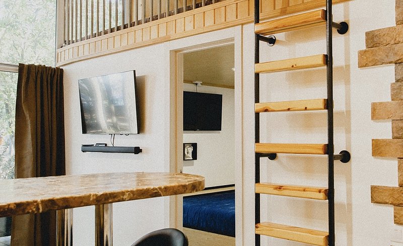 В каждом домике на втором этаже имеется спальня с ортопедическим матрасом 160*200, а также раскладной диван в кухне-гостиной для дополнительных гостей. Бонусом — прекрасный вид из окна на коренную Волгу и одну из достопримечательностей Саратовской области — Змеевые горы!