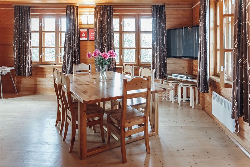 - Большая столовая (30 м.кв). Большой обеденный стол, спутниковой ТВ, домашний кинотеатр, кухня с газовой плитой, холодильник, посуда, эл. чайник, пароварка, микроволновка, камин, печь.;