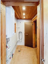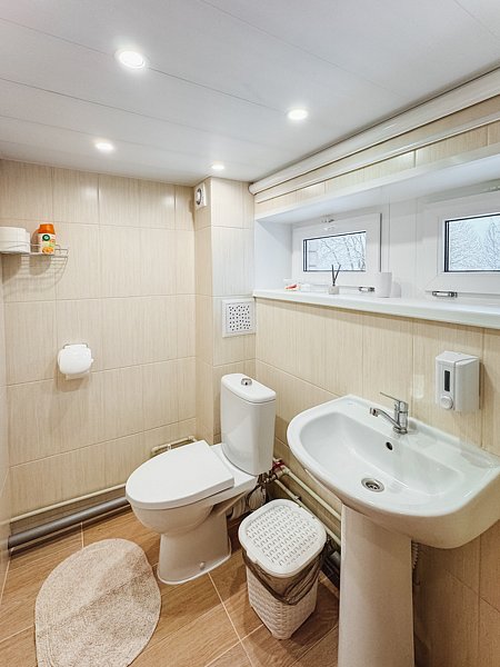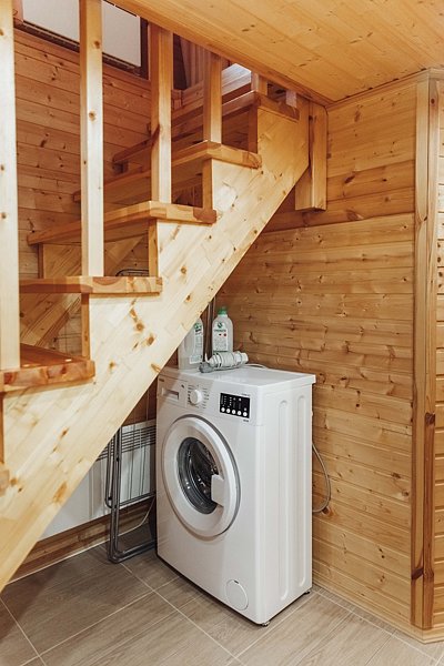 Первый этаж (цокольный). Душ, сан.узел, стиральная машина. Дровяная баня