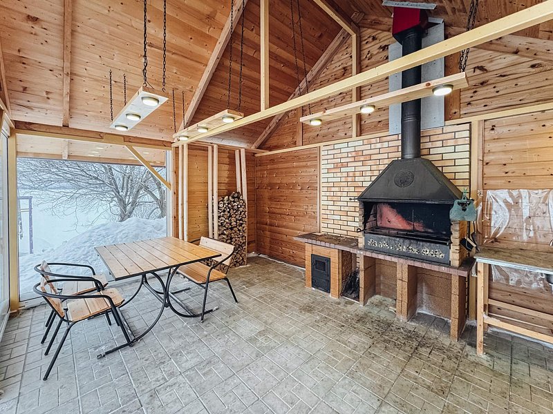 Одним из главных преимуществ дома является наличие собственной бани на дровах с уютным предбанником и панорамными окнами, из которых открывается живописный вид на озеро. Рядом с банным комплексом оборудована просторная мангальная зона, оснащенная всем необходимым для приятного времяпрепровождения на свежем воздухе.